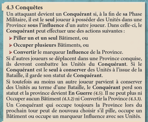 Pour Piller il faut être Conquerant → Pour être Conquerant, il faut être seul sur la Province a la fin de sa phase Militaire.