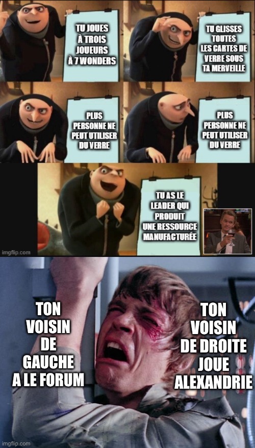 @mastermindm J’avais pris soin de garder pour moi les cartes jaunes qui donne une ressource manufacturée, et Alexandrie n’était pas en jeu. J’étais littéralement le seul à avoir accès au verre durant le troisième âge, le plan était effectivement parfait ![]()