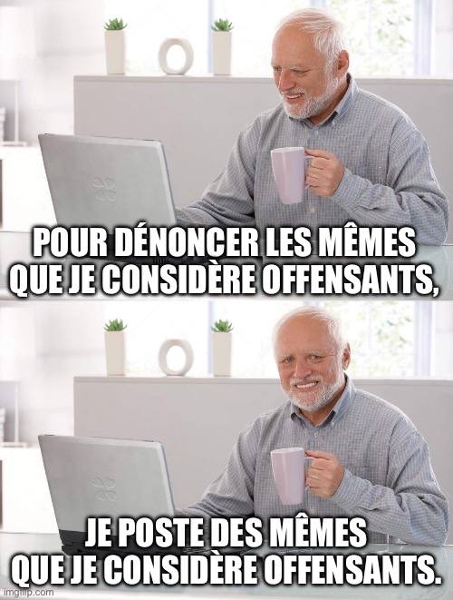 C’est un meme qui vise une personne précise donc si cette personne le juge de façon offensante, je ne suis pas sûr que le meme ait sa place ici.