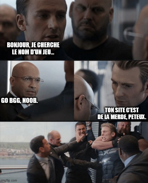 Une solution serait peut-être de créer un mème "go BGG noob" qu'on posterait direct sur chaque topic de question con. Et comme ça on resterait bien tranquille sur notre forum, entre nous, vrais connaisseurs de la chose ludique.