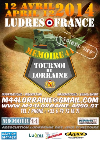 L’ Association Ludréenne des Jeux d’Histoire » (ALJH) basé à Ludres (54 près de Nancy) vous propose l’organisation d’un tournoi Mémoire 44 , le 12 avril 2014 à Ludres, officialisé par la Fédération Francaise de Mémoire 44 (FFM44) et Days of wonder.