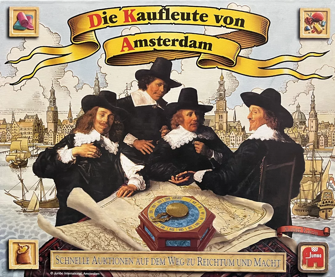 Tout d’abord il faut évacuer un point assez crucial. Merchants of Andromeda n’est PAS un jeu de Reiner Knizia. Il s’agit plutôt, comme quelques autres sorties récentes de chez allplay & cie, d’un redéveloppement récent d’un jeu ancien. Dans le cas présent on est plutôt face à un genre de “inspiré d’une histoire vraie”. Ici c’est un jeu de Knizia ancien (2000) et plutôt oublié qui a eu droit à sa version Netflix, à savoir: Die Kaufleute von Amsterdam. Il se trouve que c’est l’un de ses titres les plus thématiques. Si, si, je vous jure. Le cœur du jeu et gimmick matériel est une enchère hollandaise utilisant un bidule à ressort.