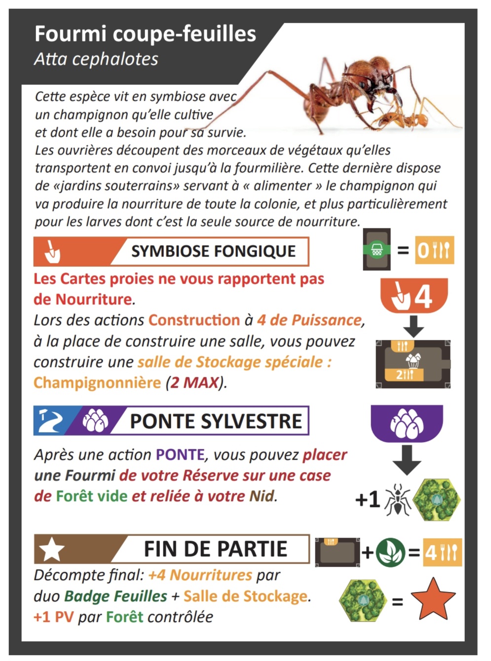 Alors vu que les deux auteurs sont des potes, dans un soucis de neutralité, et comme je l’avais fait pour Biotopes, je vais éviter des commentaires qualitatifs même si je dois bien vous l’avouer, j’aime beaucoup cette cocréation pour un jeu dans lequel on mène une colonie de fourmis bien précise (entendez que le jeu est asymétrique avec 16 espèces de fourmis différentes), vous pouvez agrandir votre fourmilière, exploiter son environnement, chasser (