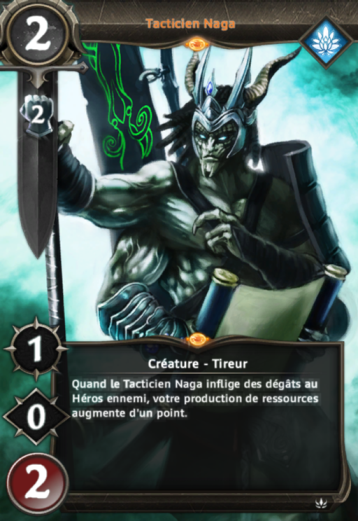 Il s’agit des unités que vous enverrez sur le champ de bataille, dans un des 8 emplacements situés de votre côté du jeu. Elles appartiennent nécessairement à une des 5 factions, ou sont “neutres”. Les unités de type “mêlée” ne peuvent être placées que sur la colonne de front, et ne peuvent attaquer que la créature directement en face d’elles. S’il n’y en a pas, elles peuvent directement s’attaquer au héros adverse !