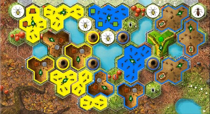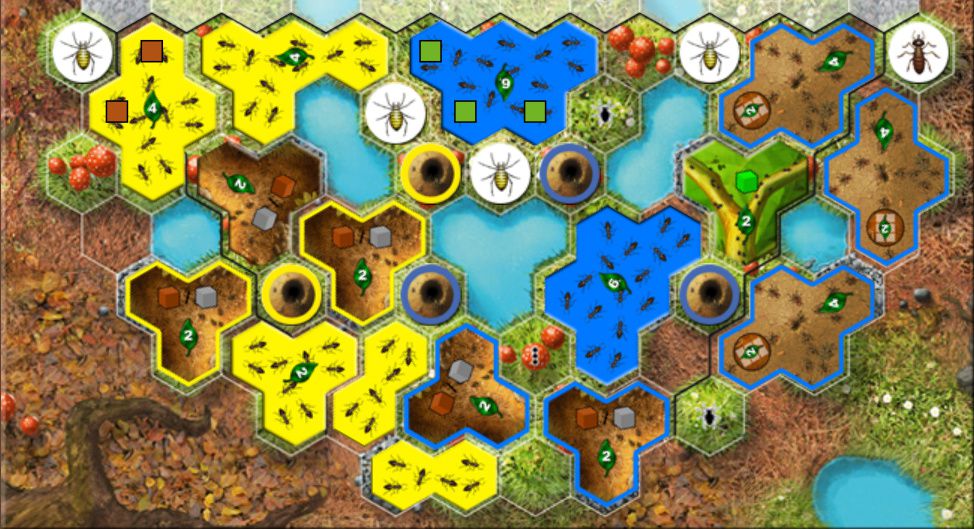 Le stock de cubes à sa couleur pour poser sur les tuiles spéciales est limité (à quatre), mais a priori (même si la règle ne le dis pas), on doit pouvoir poser plus de quatre tuiles spéciales (Thomas Cauet le fait dans sa partie commentée sur son blog, les utilisateurs de Myrmes sur BàJ sauront sans doute me dire que c’est possible).