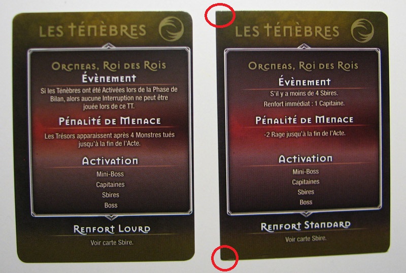 Bonjour, Tiens, j’ai un souci (pas trop grave par rapport au fait qu’il manque des choses à certains), c’est que j’ai des cartes qui sont mal découpées sur mes bords, les bords étant carrés au lieu d’arrondi : Pas très grave si on a des sleeves, ce qui n’est pas mon cas ( (à part ceux des héros). Mais autant pour nous, qui n’avons pas payé le pack Français, je dirais dans l’absolu, pas trop grave mais si c’est pareil pour ceux qui vont acheter ce pack à 35 dollars, je trouve que c’est fort dommage… Pour le wiki, à mettre peut-être, le nb de cartes Boss par boss : La mort Rampante : 2 cartes Bones : 2 cartes Orcneas : 2 cartes Le roi-de-rats : 4 cartes Syclopt : 2 cartes Ia : 1 carte Urulok : 1 carte Salutations ludiques. Lionel