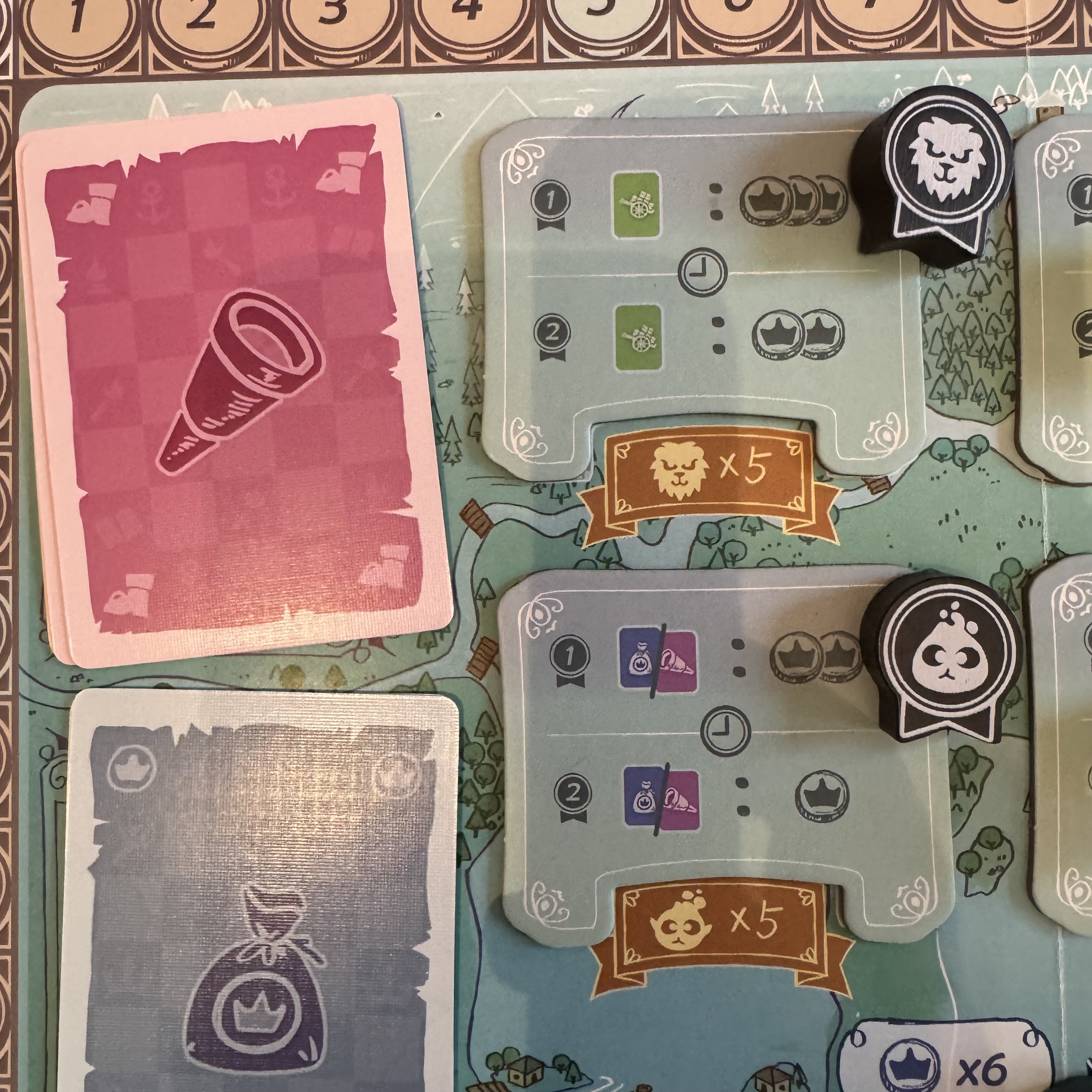 Forcément ma tête de bidule j’ai envie de la rentabiliser et de concourir à en avoir 5 pour scorer mes cartes. Je regarde vite fait le plateau des récompenses tête de bidule et y’a un joli combo à se faire en se focalisant sur 3 d’entre elles. Sauf que 3 fois 5 cartes c’est beaucoup alors je vise 2 tête de bidule. Ça tombe bien des doubles têtes de lion son dans le draft ouvert. Je saute dessus à la première occasion, tout en ayant une carte bleue dans le collimateur, elle m’offre à chaque fin de manche 1PV par tête de lion. Alors c’est le rush !