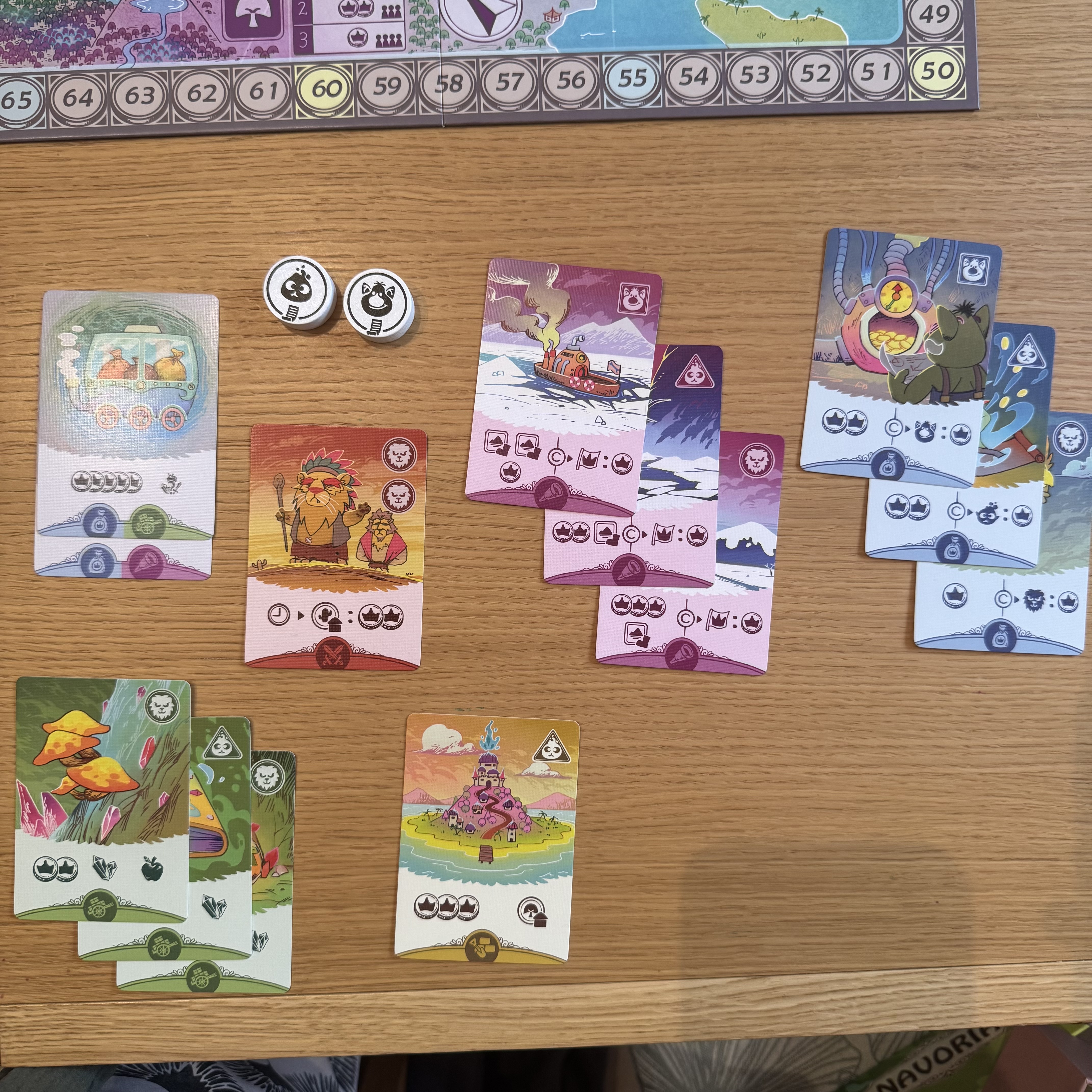 Enfin, sur l’ergonomie : au final, tout se passe pas mal sur les cartes. Mais côté gameplay, celles-ci sont “de côté” : du côté du plateau central, à côté de nos plateaux persos, sans trop savoir où les mettre. Limite, le plateau aurait pu être composé de 3 bêtes échelles (comme les 3 pistes religion de Terra Mystica) où avancer et poser nos avant-postes…