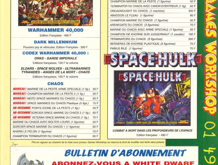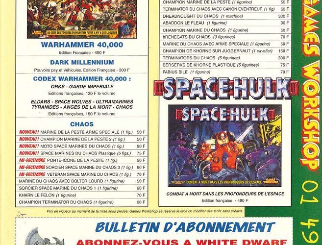 Le prix de space hulk 2éme édition (récupéré dans un vieux white dwarf que je viens de retrouver ( rangement de ma cave ^^) et dans lequel il y a des missions (campagne) pour space hulk). C’est un signe qui ne trompent pas je suis obliger de l’acheter ^^.