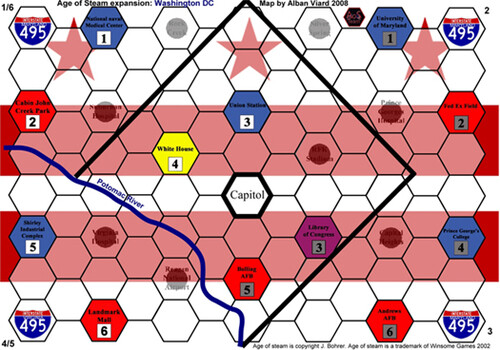 Pour la première carte, celà se passe à Washington DC, qui est entourée d’autoroutes (les 4 hexagones dans les coins) que l’on peut emprunter pour se retrouver dans un autre hexagone automatiquement. Seulement les embouteillages ont tendances à couper votre réseau… Pour la deuxieme carte, Ludo en a fait une partie, donc il suffit d’aller jeter un oeil à son compte rendu… http://lgimet.over-blog.com/article-23517807-6.html