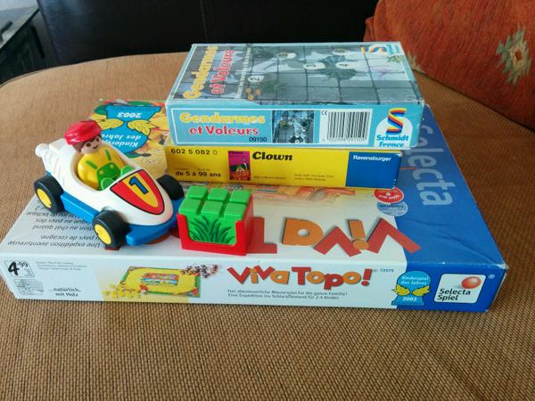 Un Selecta à 2 euros! ouais pas mal du tout; il n'a pas été massacré? c'est souvent le risque avec des jeux utilisant des tampons encreurs. Et je vois au-dessus le Clown de Ravensburger, sur le même principe que les Petits Drôles que j'aime tant (j'ai failli arracher les yeux d'une collègue de la ludothèque, qui trouvait les dessins des Petits Drôles complètement ringards). Et un mini Ravensburger de plus!