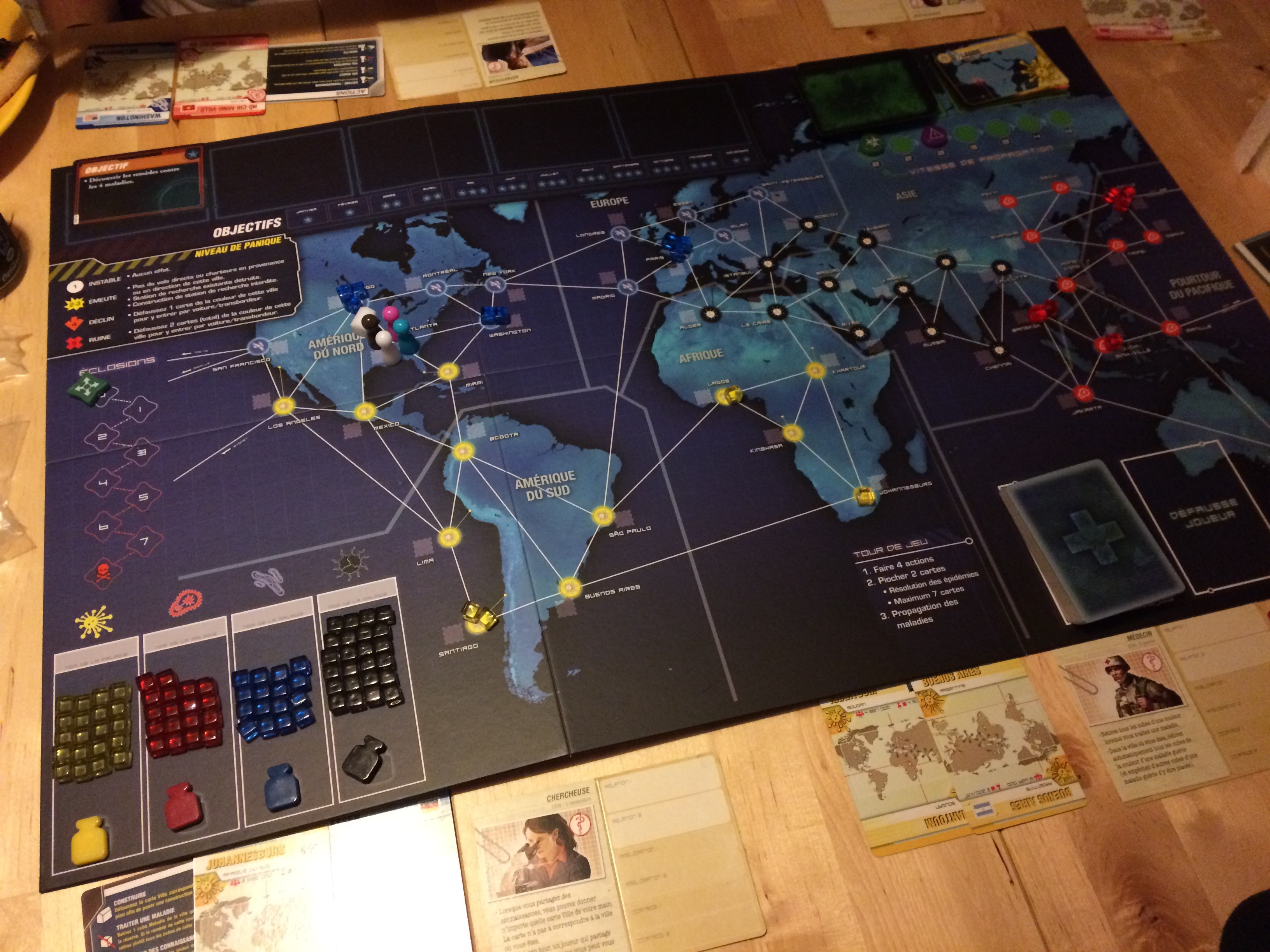 Par contre, j’ai malheureusement relevé un erreur de règle dans les sessions que j’ai lu, avec un impact assez important sur le niveau de difficulté à long terme : Il est possible d’améliorer avec une mutation positive uniquement si la maladie a été éradiquée (et non pas seulement guérie). J’ai relevé au moins 1 fois le soucis (en février pour la maladie jaune) et peut-être encore plus tard ? J’espère que ça n’aura pas trop détérioré ton expérience de jeu à la longue… J’ai préféré l’indiquer ici pour d’éventuels lecteurs qui passeraient par là.