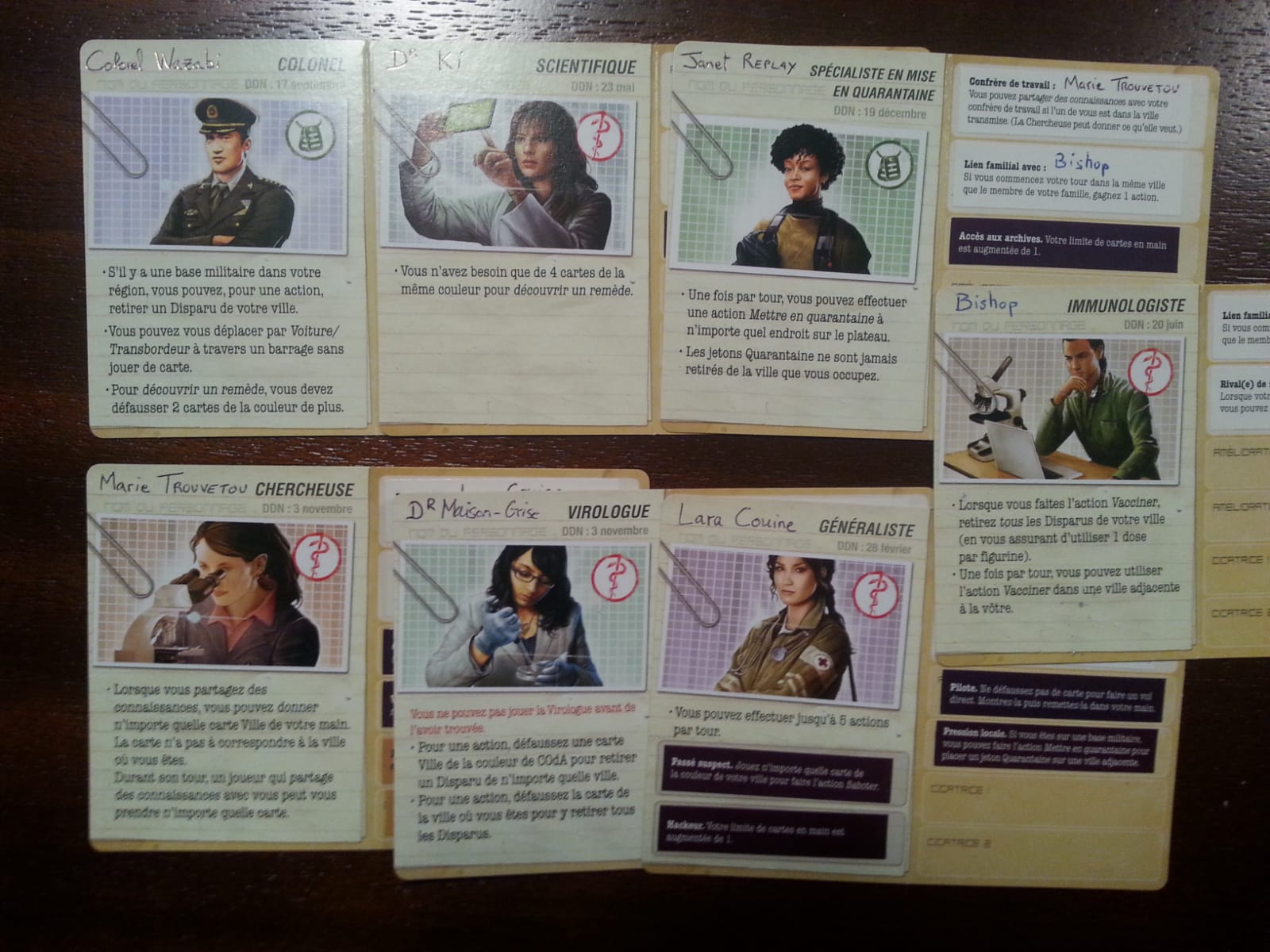 Les Personnages :Le duo le plus joué, de loin, fut Généraliste (avec Pilote et Pression locale) + Chercheuse (avec Vétéran pour exploiter la mobilité militaire).