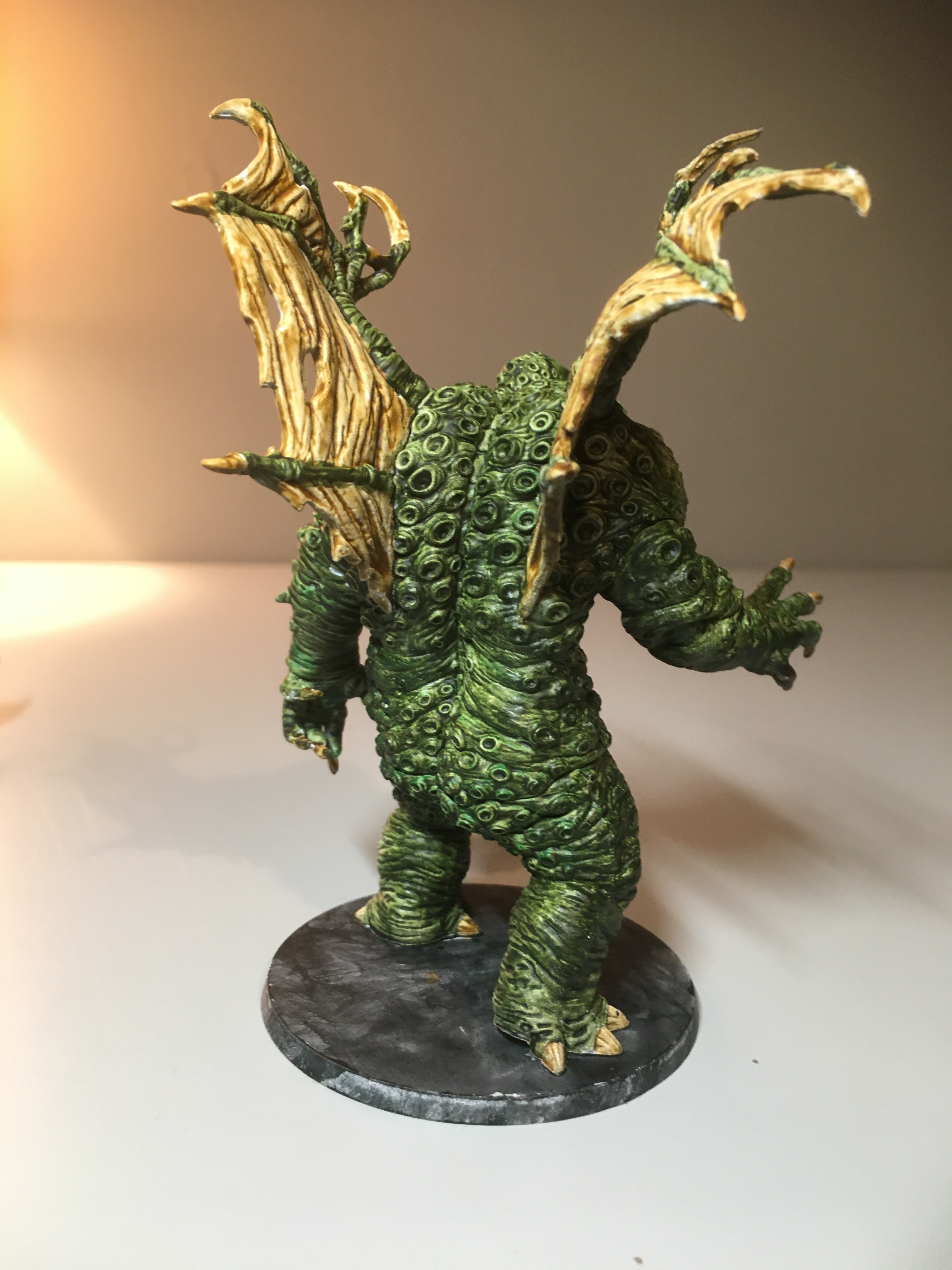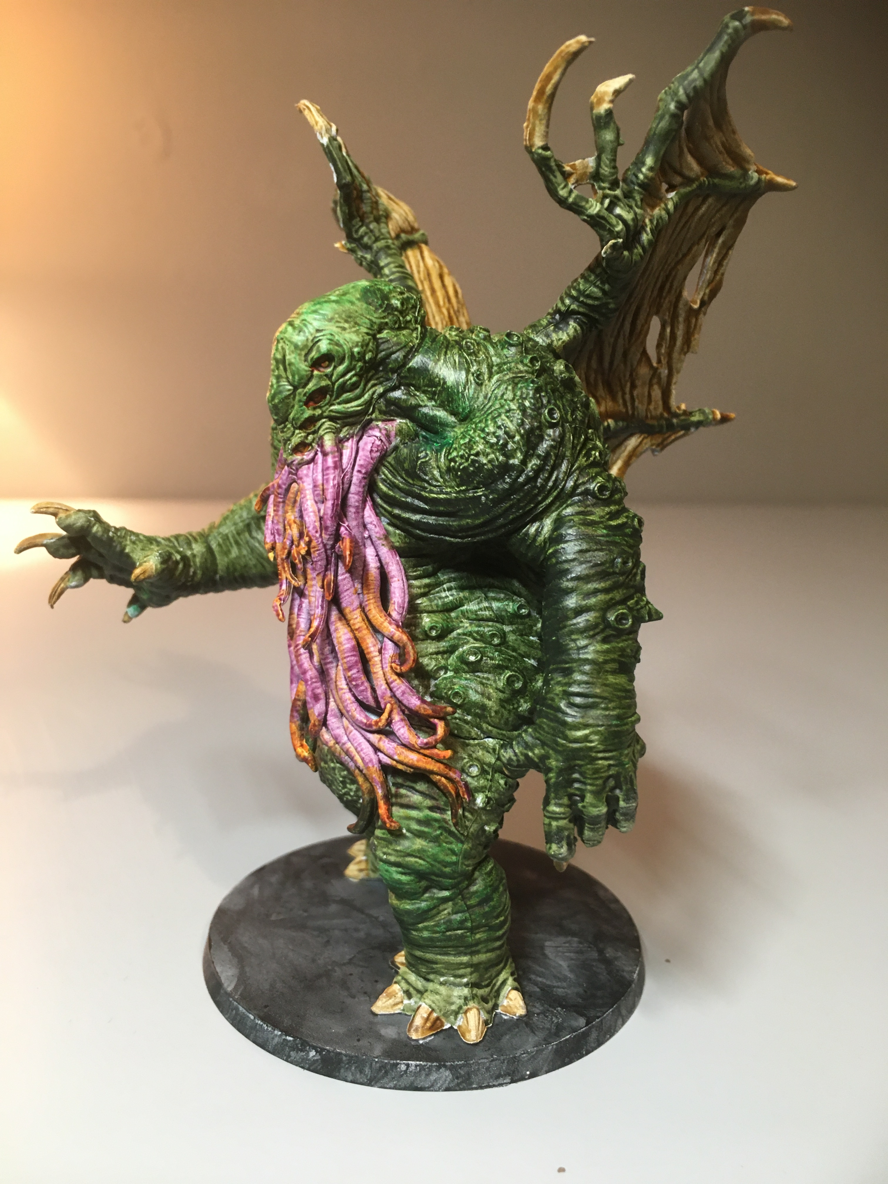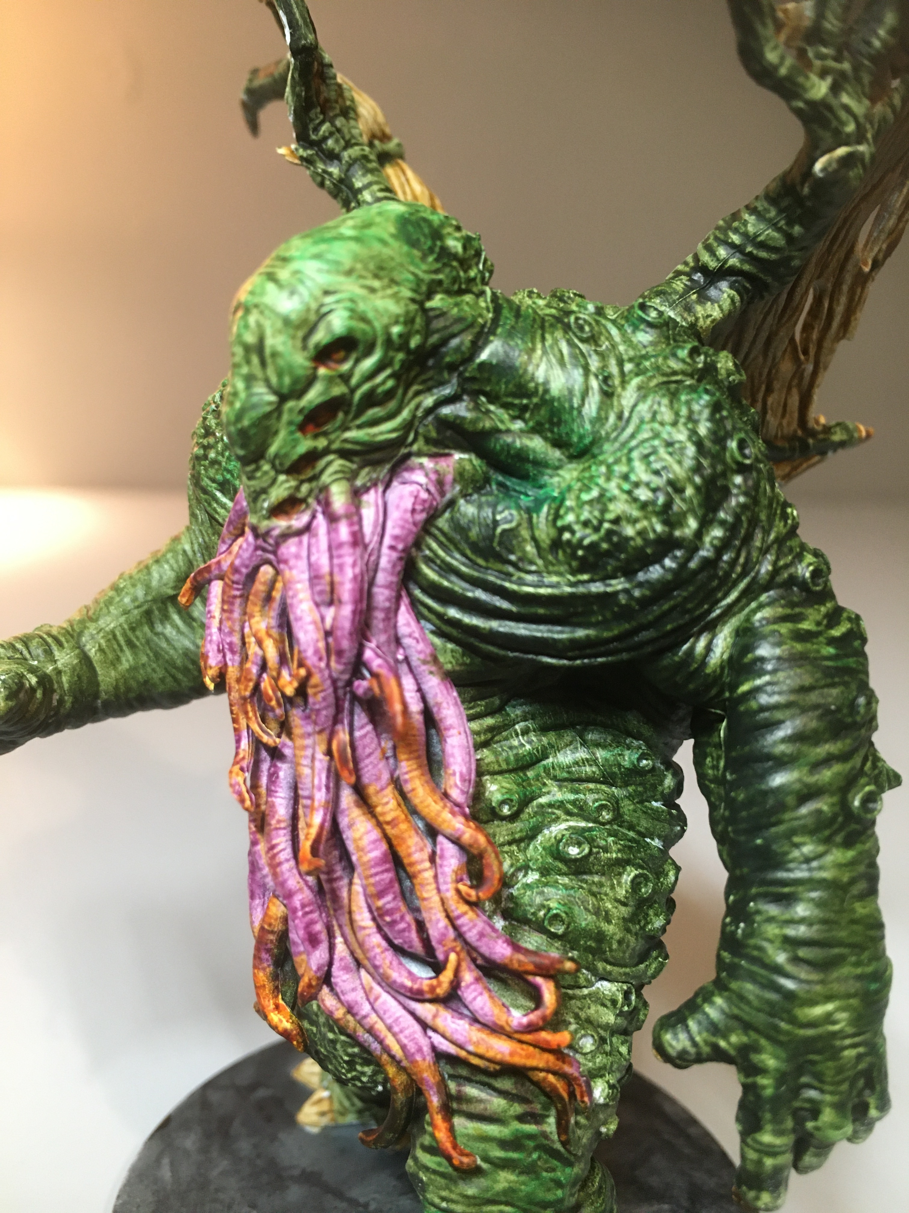 Tu px faire un petit brossage à sec pour faire ressortir les arêtes et détails en particulier sur le Cthulhu. Ça apportera un peu plus de lumière et de contrast. Pour les tentacules tu peux tenter une prochaine fois un peu de wet blending, c’est top pour ça la contrast.