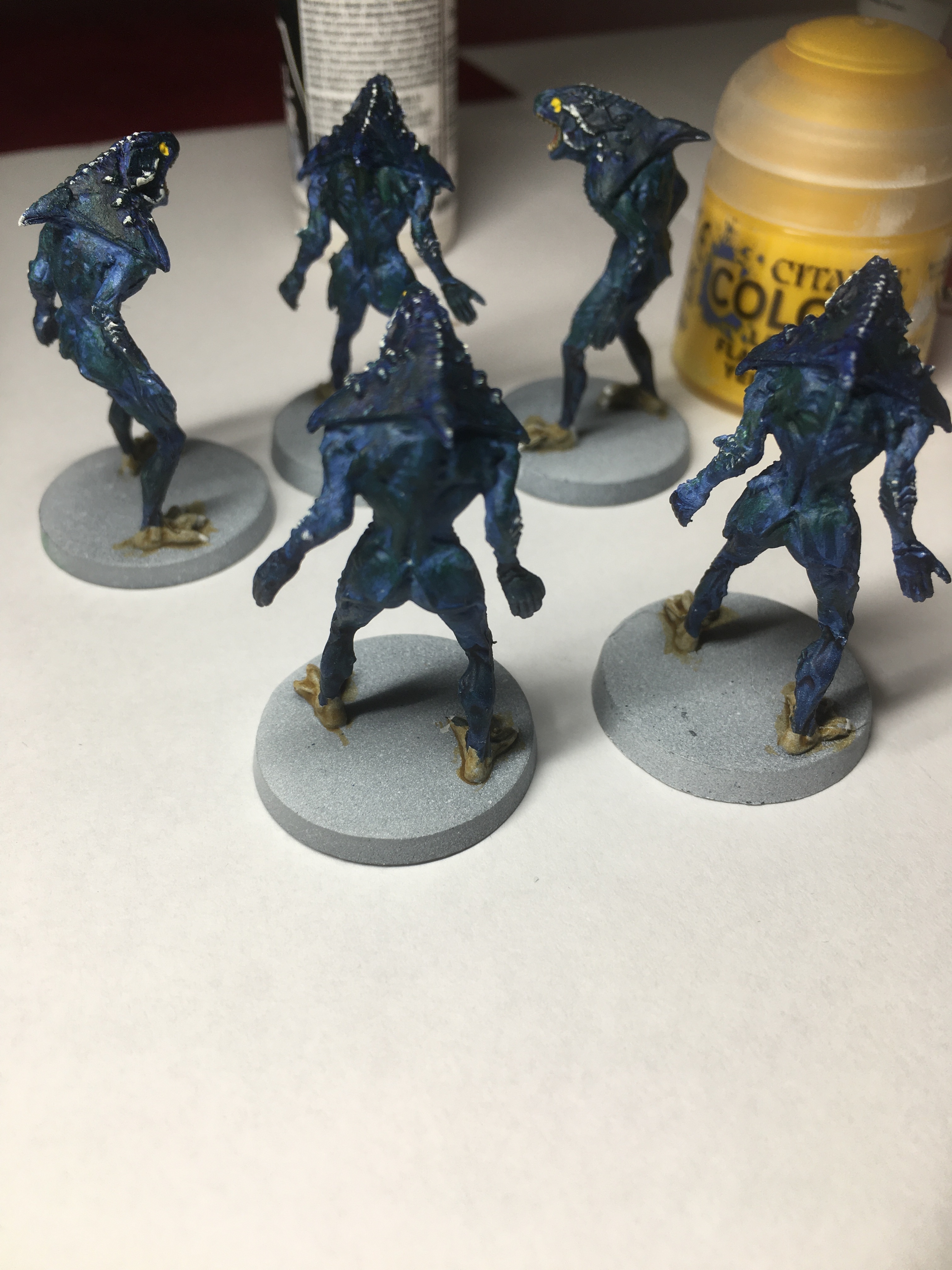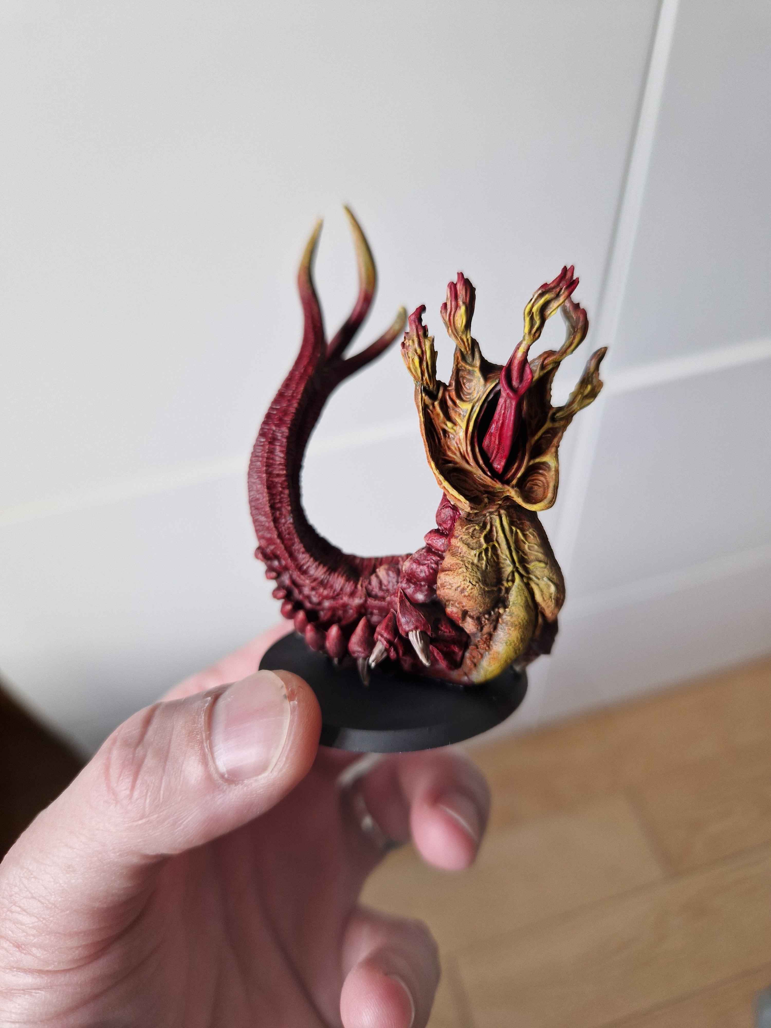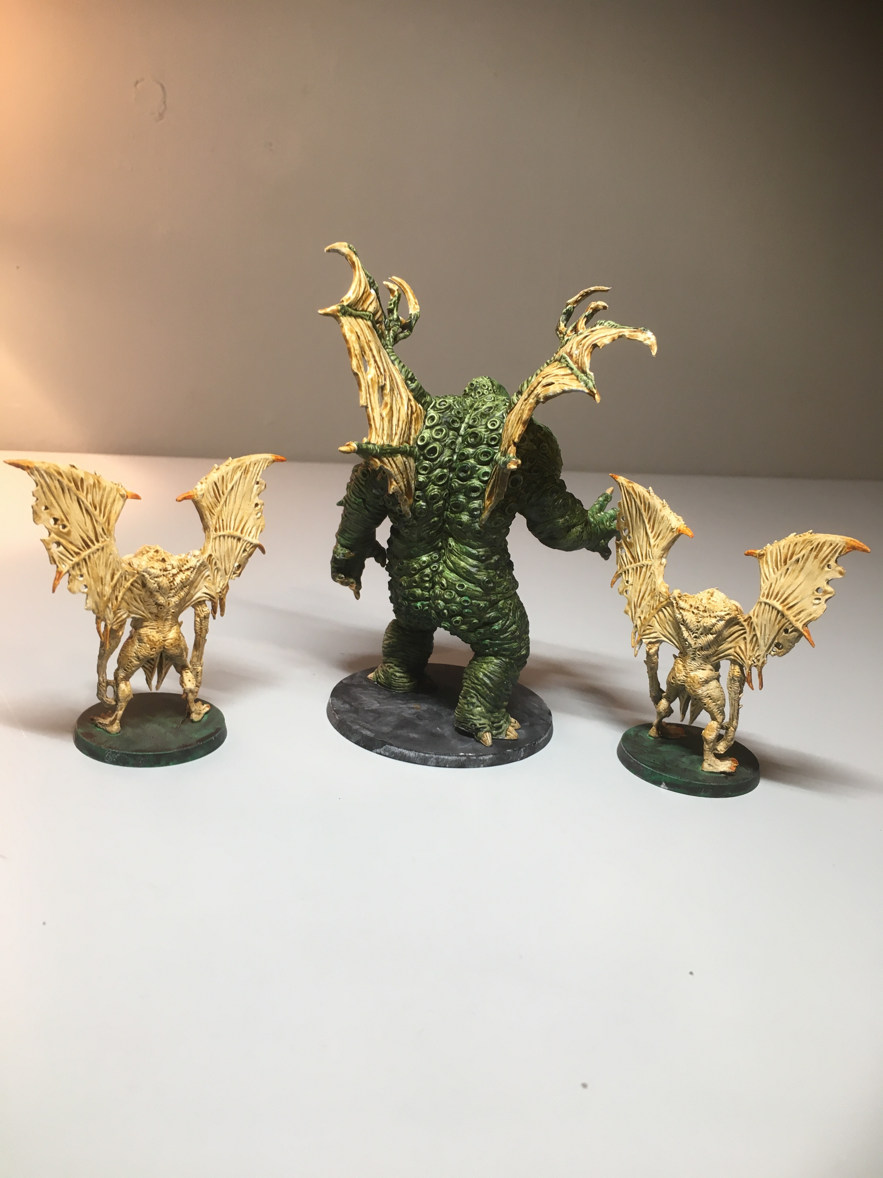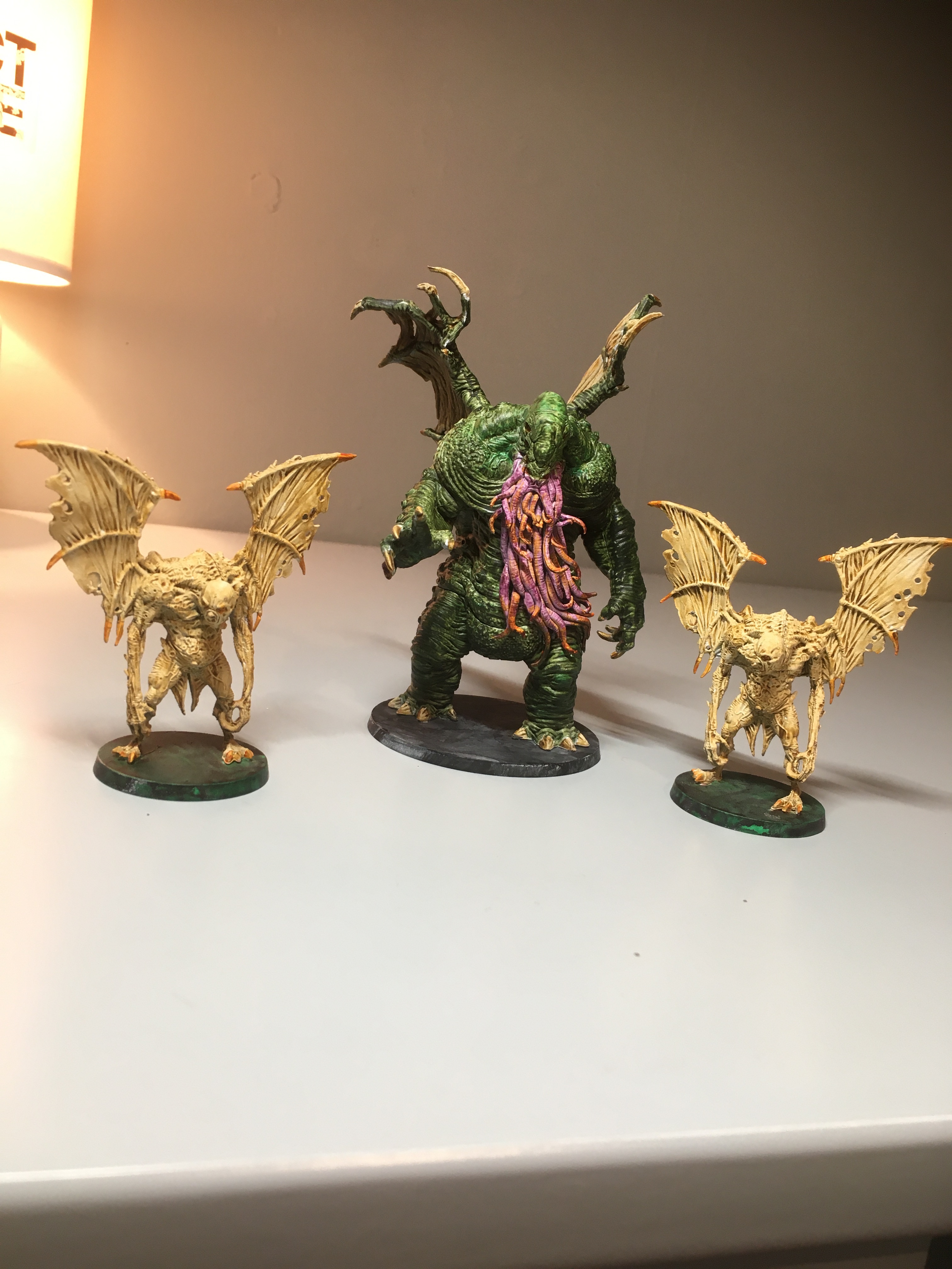 Tu px faire un petit brossage à sec pour faire ressortir les arêtes et détails en particulier sur le Cthulhu. Ça apportera un peu plus de lumière et de contrast. Pour les tentacules tu peux tenter une prochaine fois un peu de wet blending, c’est top pour ça la contrast.