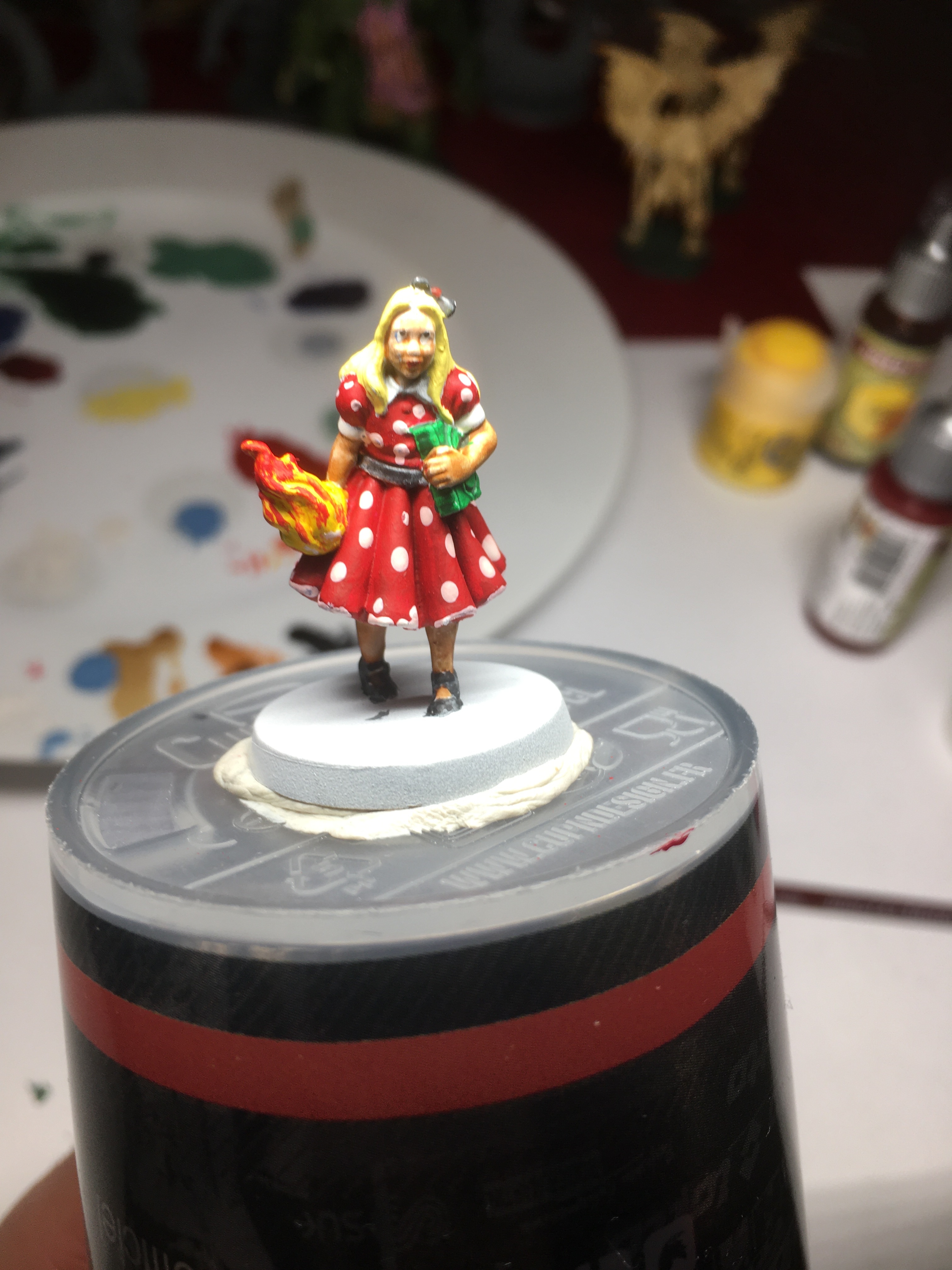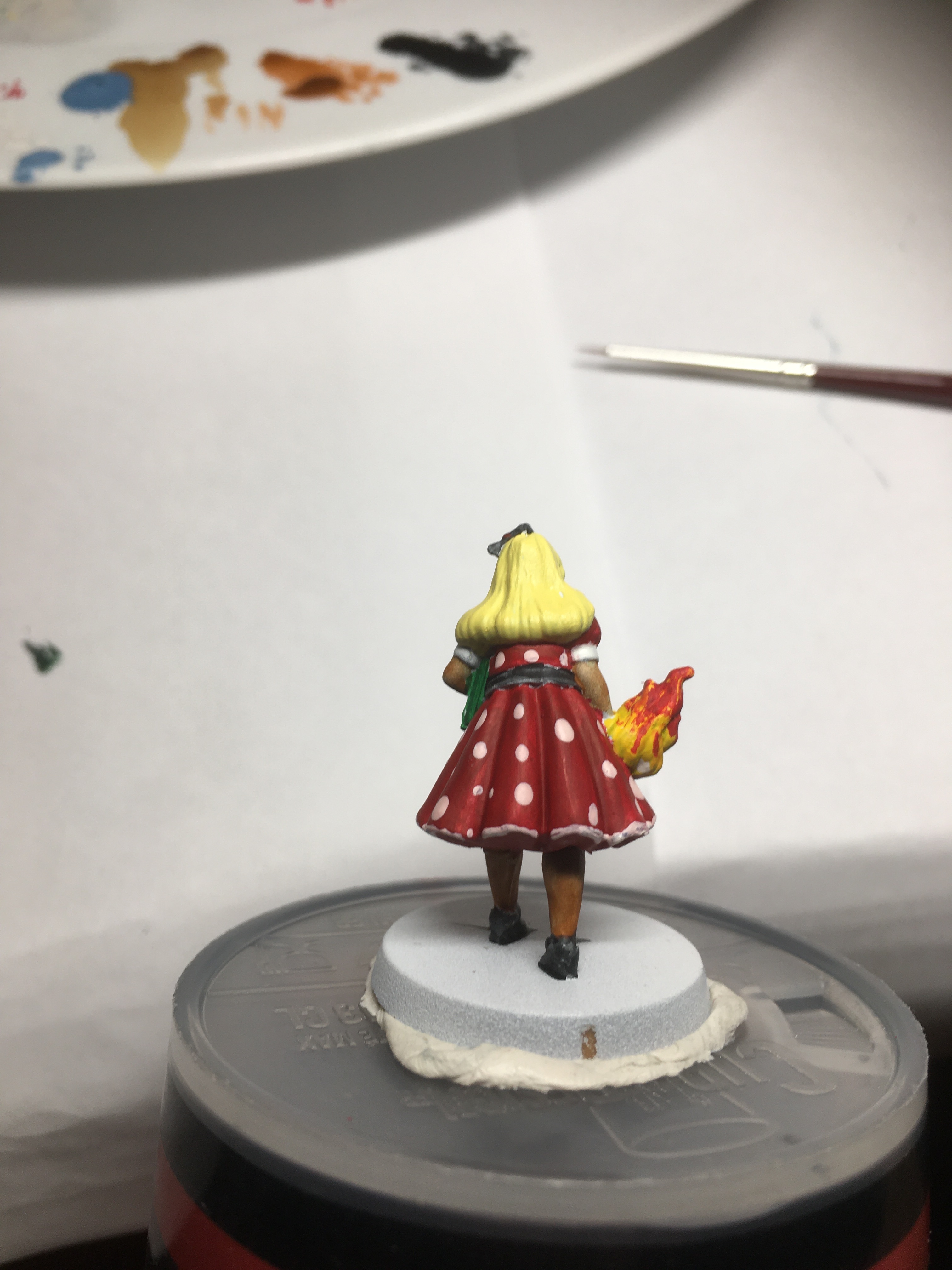 Pour les points blancs, j ai utilisé le dos du pinceau, 1 trampette dans le blanc, un point sur mon assiette puis un point sur la figurine….