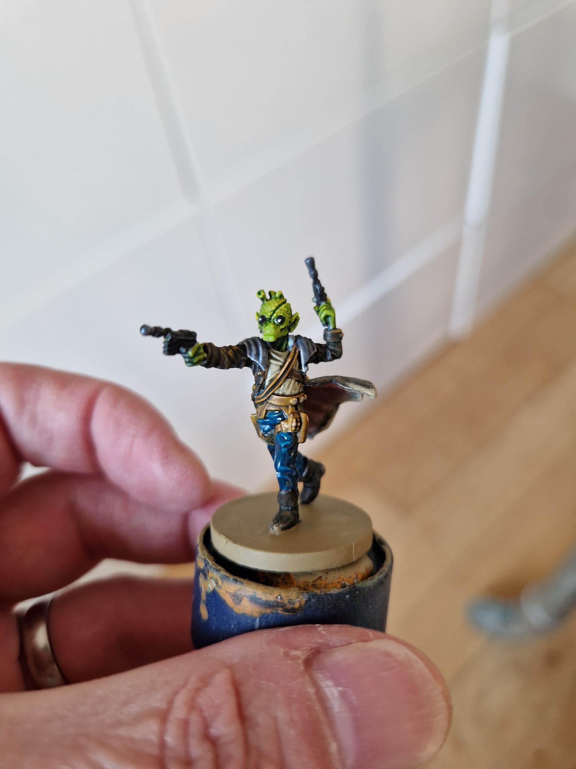 Ca demande une main stable et une bonne prise sur la figurine (donc important de la fixer sur une poignée/boite de pillules/bout de carton), mais je trouve ça plus facile de faire deux traits au pinceau 0 que je retouche ensuite que d’essayer de positionner précisément un point au 5/0