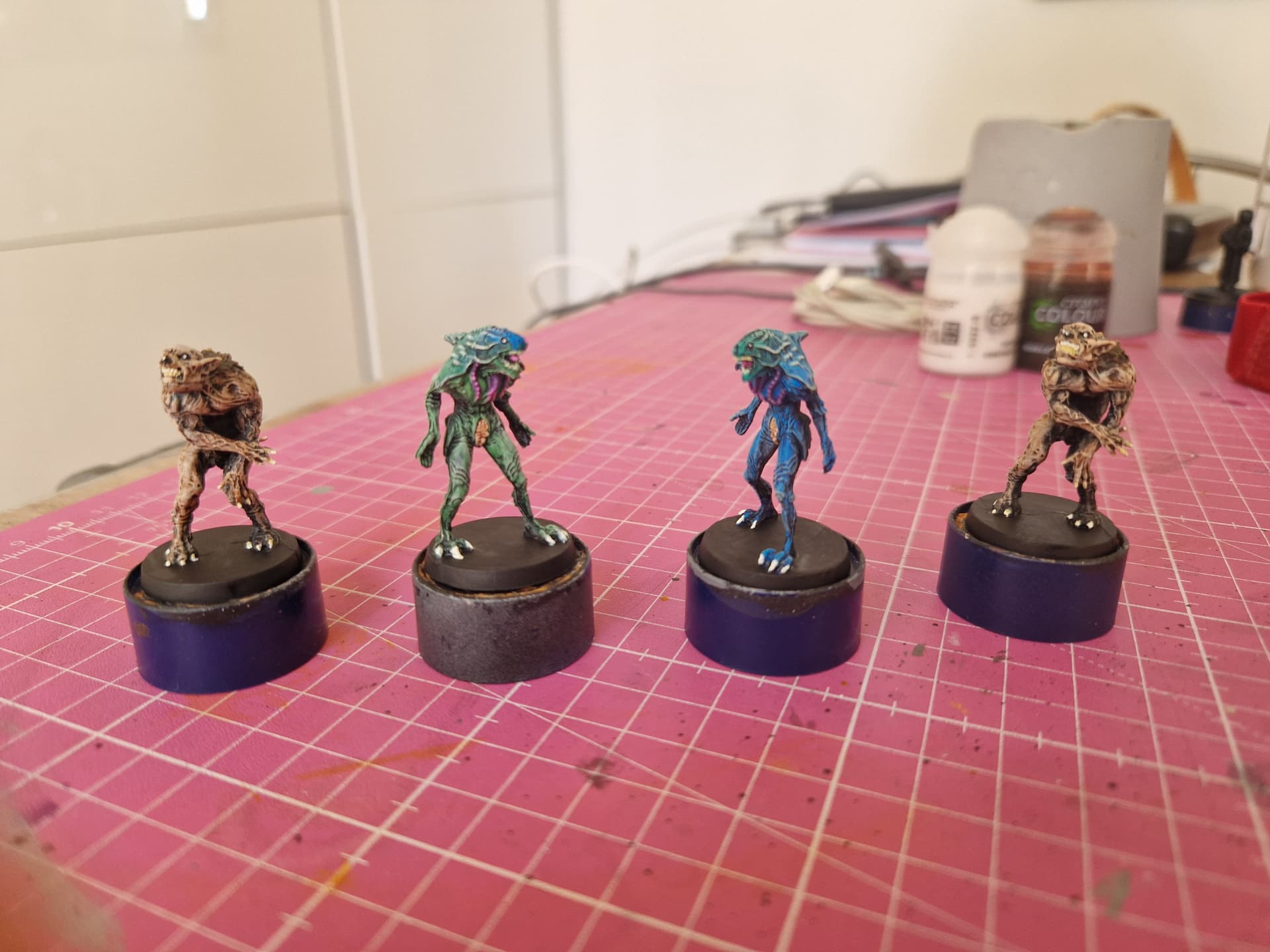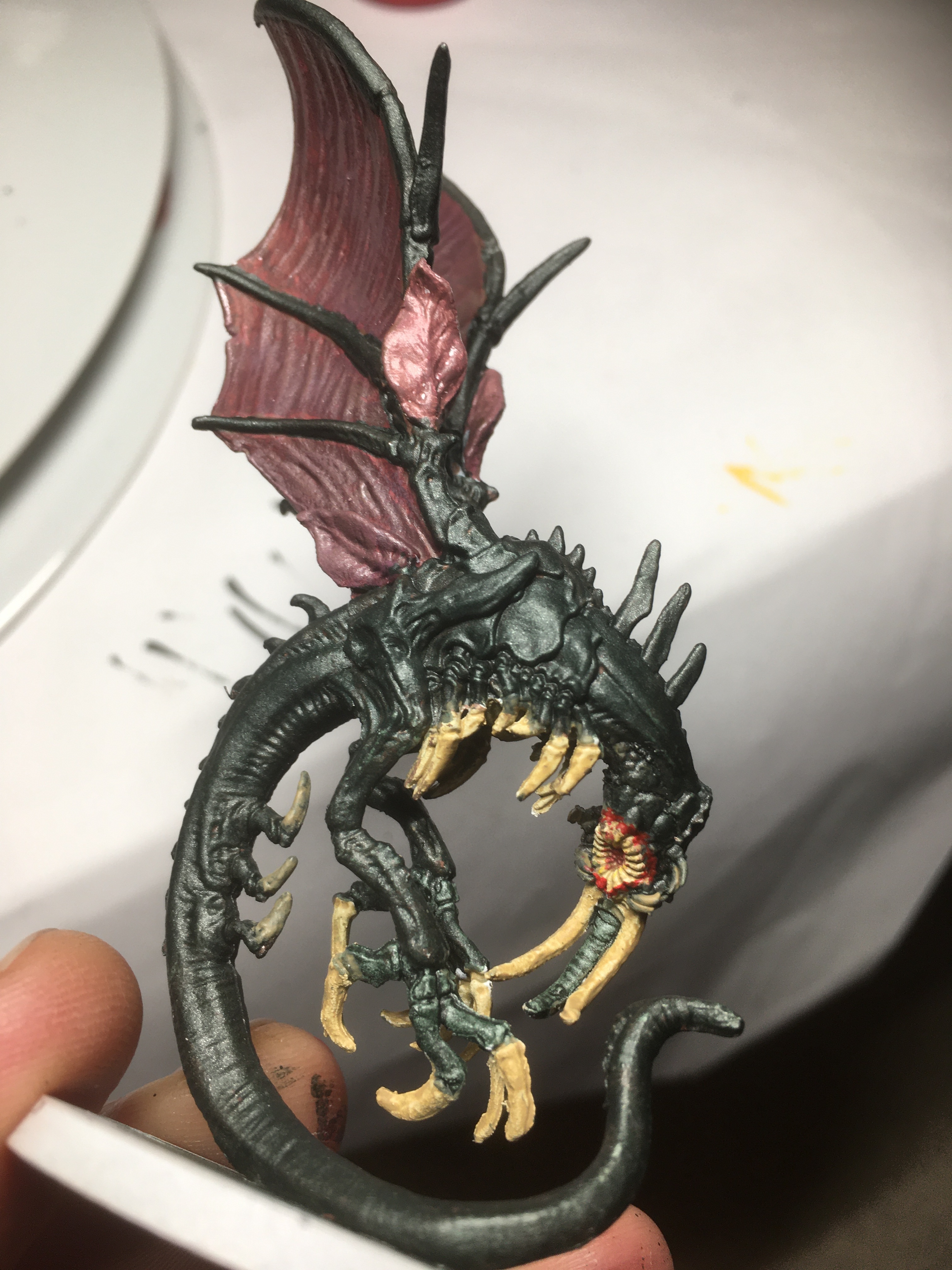 J ai réussi à trouver la couleur foncé vert noir métal que je voulais, l association avec le violet est un poil sombre mais c est pas mal, j ai réussi à faire des points ultra petit et propre sur le visage, skeleton horde éclairci sur les griffes est bien aussi. Je ne procrastine pas MOI.