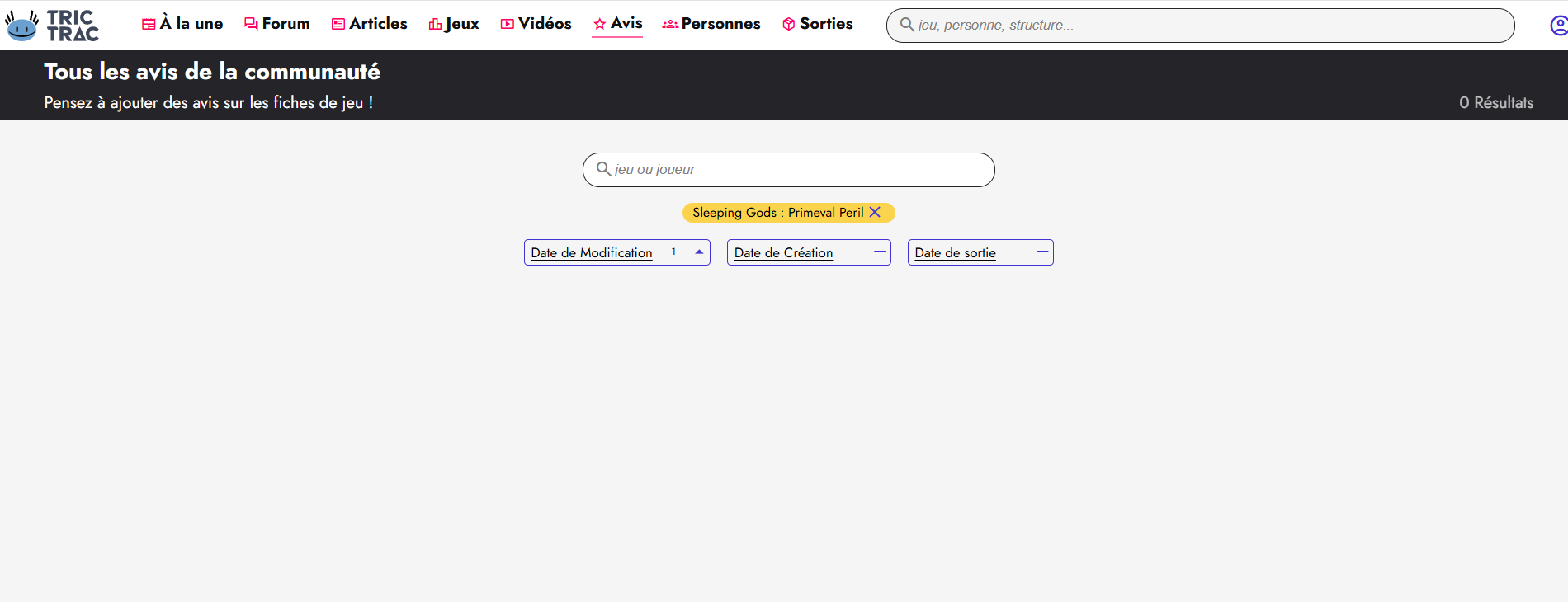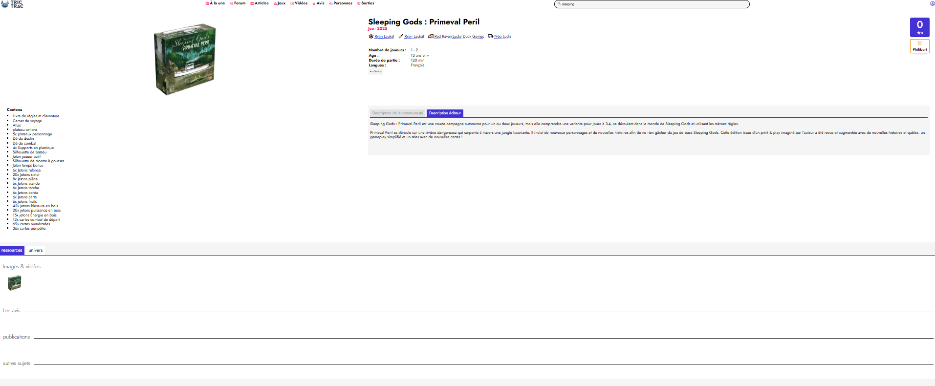 Par exemple, je veux mettre un avis sur Seeping Gods Primeval Peril. Je cherche le jeu dans la BDD et ensuite je ne sais pas quoi faire. Je ne peux pas cliquer sur le rectangle de la note, ni rien faire sur la partie Avis :