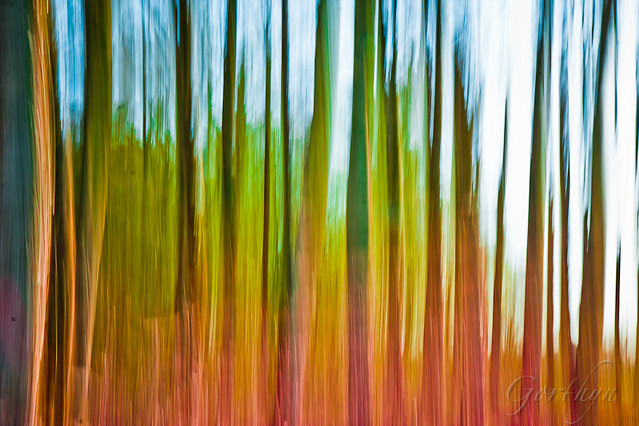 La première photo est une prise lente avec effet de filé vertical sur des troncs d’arbres.