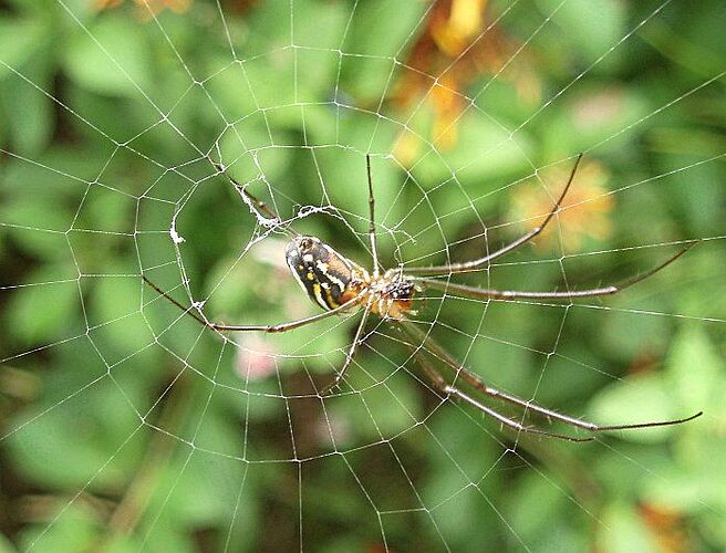 ) . J’avais repéré l’araignée l’après-midi (pris un ou deux clichés en mode rapproché, mais rien d’extra) et le soir, au soleil couchant, j’ai réussi a avoir un fond noir (haie en contre-jour) alors que la toile était éclairée en lumière rasante.