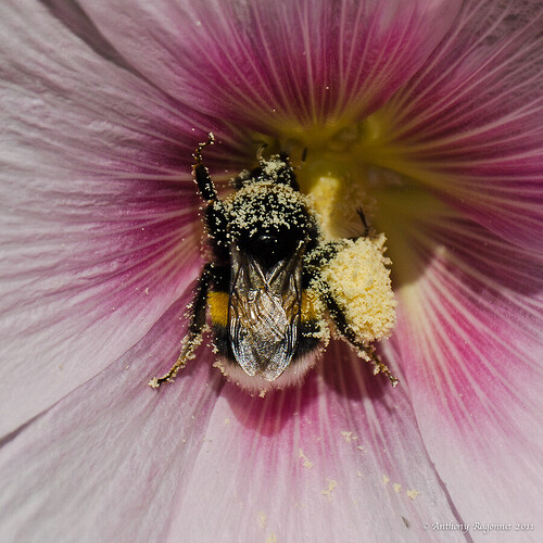 Allez tiens, une dernière pas très originale pour terminer le mois, mais ce gros bourdon (il était vraiment énorme) m’a bien fait marrer parce qu’il était plein de pollen et continuait à vouloir en prendre.