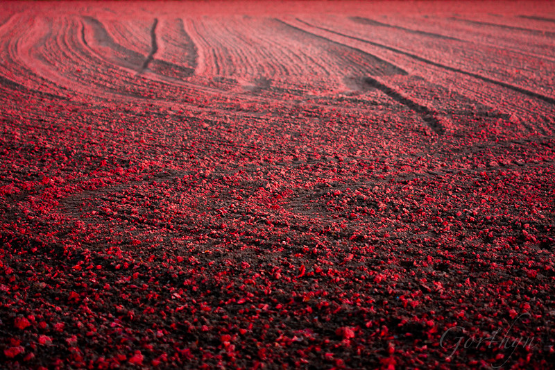Pour la lumière surréaliste : en promenant mon Golden ce soir, on était sur le point de rentrer (une fois le portrait de monsieur réalisé), et en me retournant une dernière fois, je vois le soleil couchant qui devient rose, puis rougeoyant... J'ai tenté des prises de vues au travers les feuillages, mais rien ne m'a vraiment plus... En me retournant pour définitivement rentrer, dos au soleil donc, les rayons rasants de ce soleil rougeoyant ont donné un aspect surréaliste à ce champs qui venait d'être fraîchement labouré (le tracteur venait à peine de sortir du champ). En post traitement, j'ai poussé un peu la vibrance et renforcé les contrasts (mais avec le soleil rasant déjà... ça marquait bien) pour lui donner ce rendu.