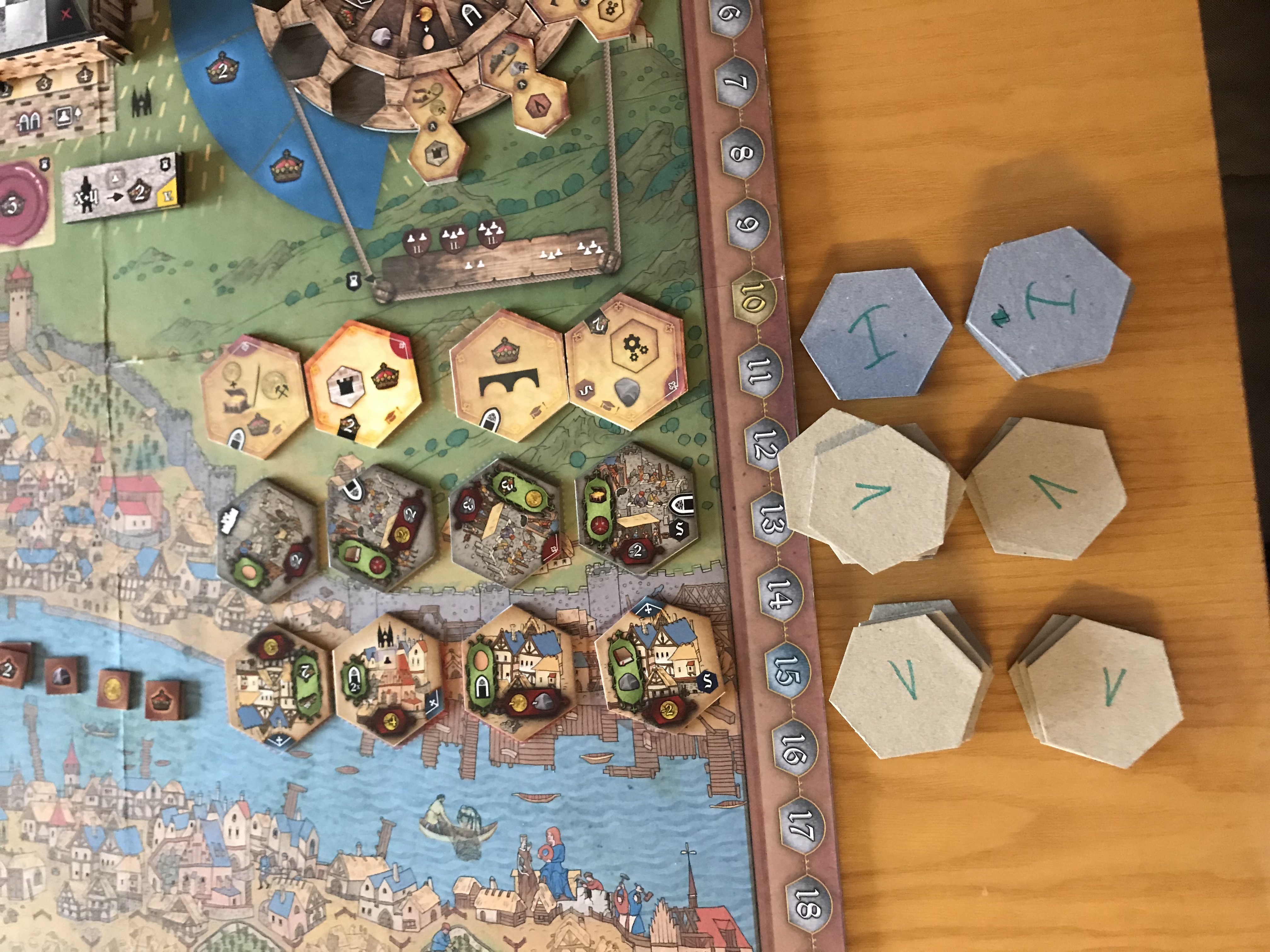 Après discussion avec les testeurs, j’ai décidé de supprimer l’action principale qui permettait aux joueurs de se déplacer sur les pistes de la cathédrale ou des murs et de la transformer en action bonus que vous obtenez lorsque vous construisez certaines tuiles du mur, réduisant ainsi le nombre d’actions principales à six. Cela s’est avéré être le nombre final d’actions dans le jeu. Ces discussions ont également conduit à la décision de simplifier la façon dont il était possible d’obtenir un déplacement supplémentaire sur les pistes de la cathédrale et des murs - en dépensant deux fenêtres blanches - ce qui a considérablement accéléré le déroulement du jeu.