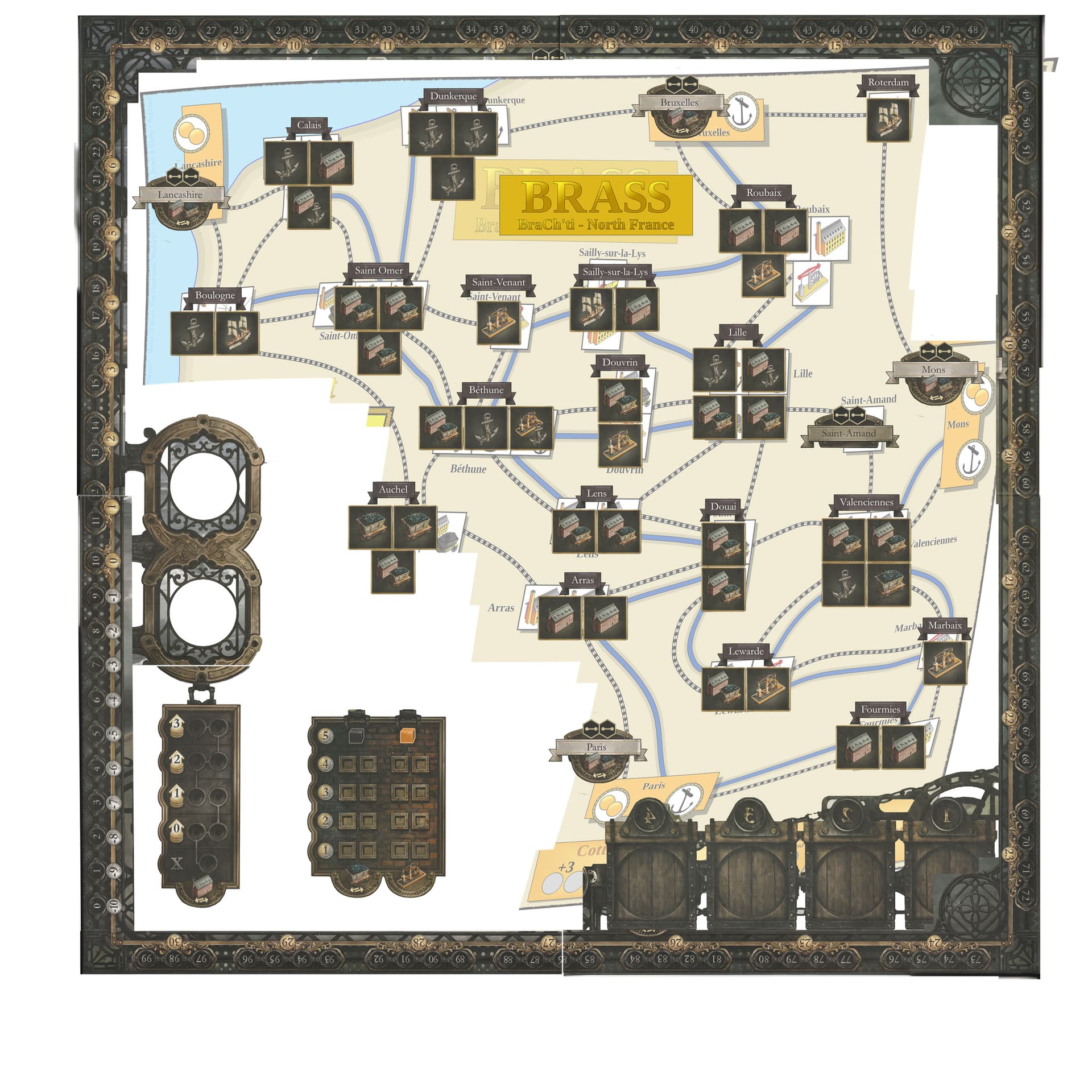 J’ai décidé dans un premier temps, de m’en faire une sorte de version roxley : je suis parti en scannant mon plateau, et en isolant les différentes icônes. Puis j’ai crée un gros fichier photoshop avec en fond la map brach’ti, un peu écrasée pour tenir en format carré, par dessus laquelle j’ai superposé mes icones déjà scannées. Pour être plus efficace, j’ai utilisé des liens, avec des références à d’autres fichiers. Comme ça si je met à jour une icône sur son fichier individuel en retravaillant dessus, tout se met à jour dans le “gros”. Voici ce que ça donne au bout de quelques heures :