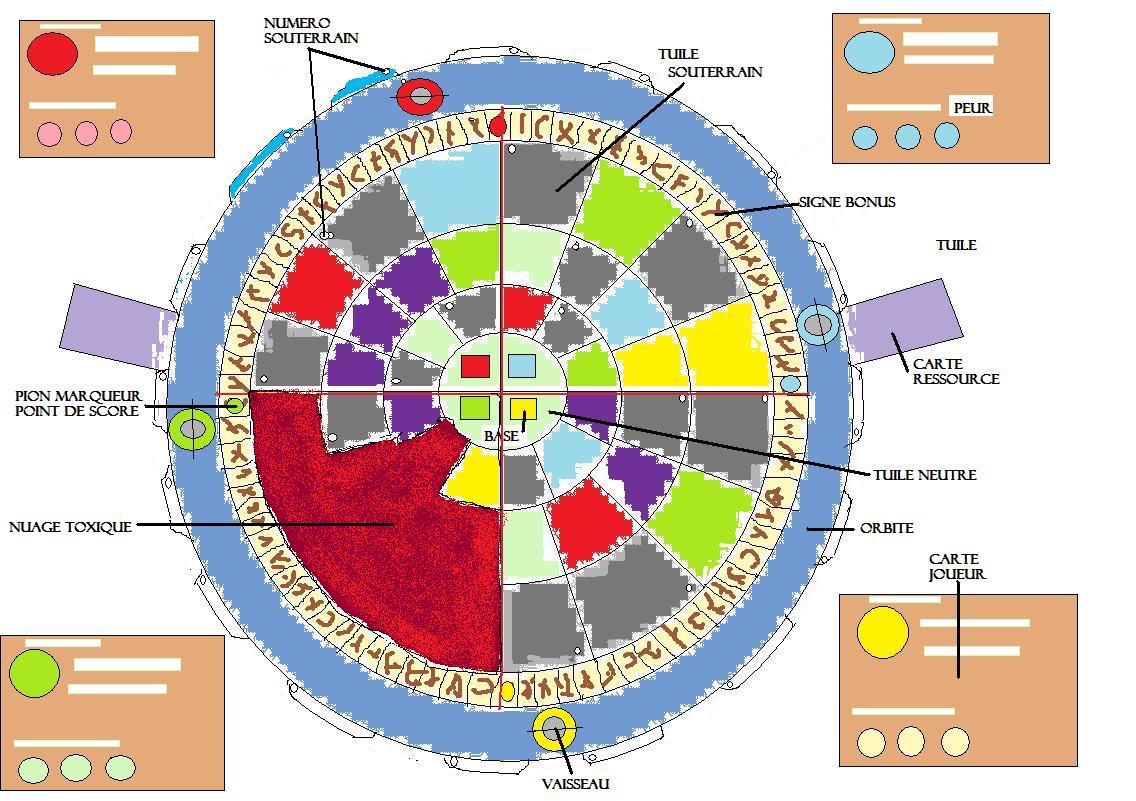 1 plateau de jeu rond représentant le nuage toxique, autour, il y a les signes ( genre alpha delta etc…) pour indiquer le score de chaque joueur, un couloir orbitale ( pour les vaisseaux ) et les emplacements numérotés pour mettre les cartes ressources.