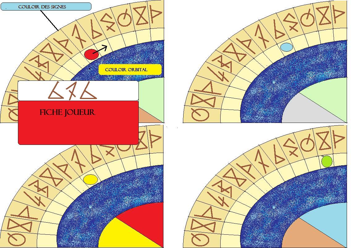chaque joueur place sa fiche devant 1 des 4 quart de la planète NUATOx, place son vaisseau en orbite, sa base au centre de NUATOx, forme ses 3 groupes d’hommes sans que les autres joueurs ne les voient et les placent sur les emplacements de sa fiche, BASE-TERRE-VAISSEAU.