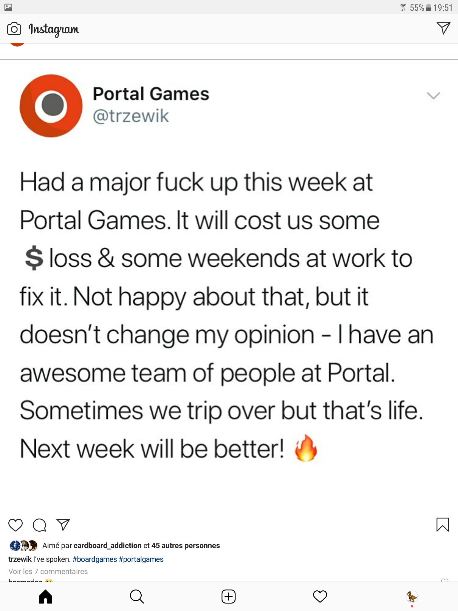 Si je traduits correctement, ils doivent avoir un souci qui va leur couter un max de thunes, mais il confirme sa pensée de base, il bosse avec une super équipe …