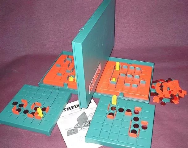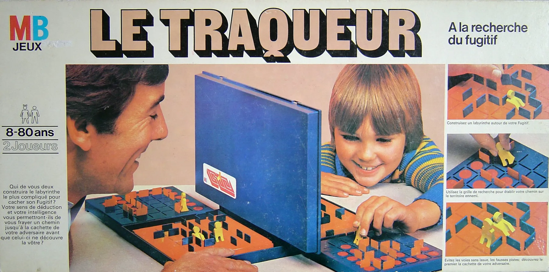 C’est un jeu pour 2 personnes. Chacun doit cacher un pion (j’ai une siège bleu en tête…) et créer un chemin, des murs avec des petits carrés en plastique que l’on enfonçait dans des fentes du plateau.