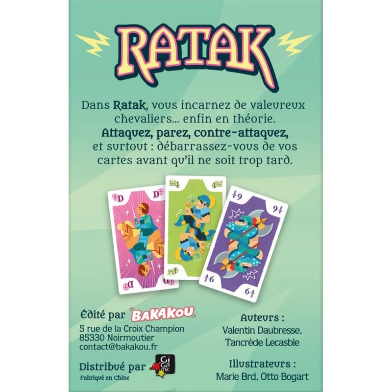 Ratak est un jeu de cartes pour 2 à 6 joueurs. Dans ce jeu de défausse, vous incarnez des chevaliers prêts à tout pour sauver leur honneur. Vous devrez attaquer, parer et contre-attaquer au bon moment afin de vous débarrasser de toutes vos cartes avant vos adversaires et remporter la partie.