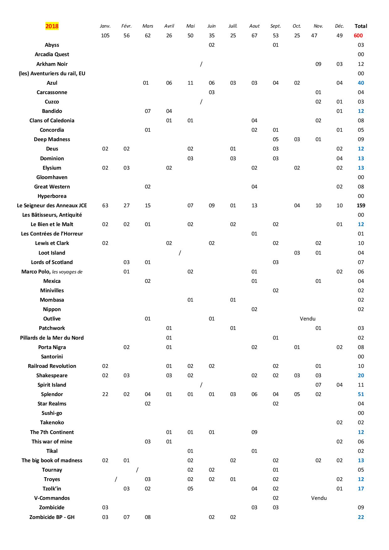 En miroir du beau sujet lancé par Molmo, j’ouvre le traditionnel sujet pour que les volontaires présentent leurs listes et statistiques pour cette année 2018 qui s’est achevée. Beaucoup de parties, beaucoup de jeux, souvent, pas assez, etc. Parlons-en !