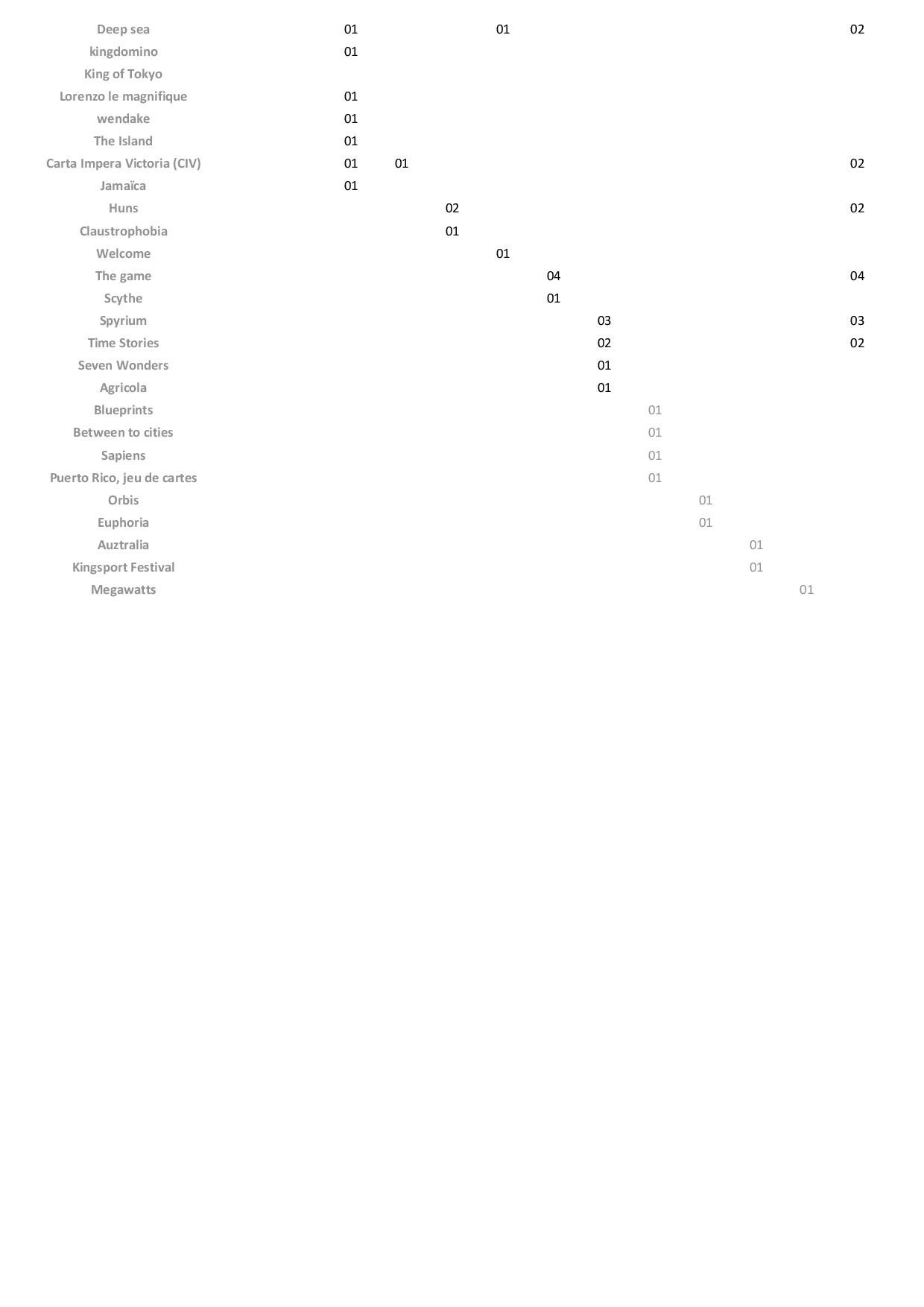 et ferment la marche avec 1 ou 2 parties : Asteroyds, AuZtralia, Bärenpark, Captain Sonar, Carpe Diem, Clans of Caledonia, Claustrophobia, Coimbra, Crokinole, Cursed Court, Echecs, Endeavor, Evolution, Exposition Universelle, Fairy Tile, Formule Dé, Gugong, Homesteaders, Huns, Keyforge, La nuit des voleurs, Les mystères de Whitehall, Loony Quest, Lords of waterdeep, Majesty, Mint Delivery, Minute Realms, Mölkky, Navegador, Puerto Rico, Pulsar 2849, Quarriors, Rising Sun, Riverboat, Robin Wood, Roll for the galaxy, Sankt Petersburg, Space Race; Splendor, Star Cartel, Tiny Epic Quest, The flow of History, Tumblin’Dice, Valletta, Watson & Holmes, Wendake, When I dream.