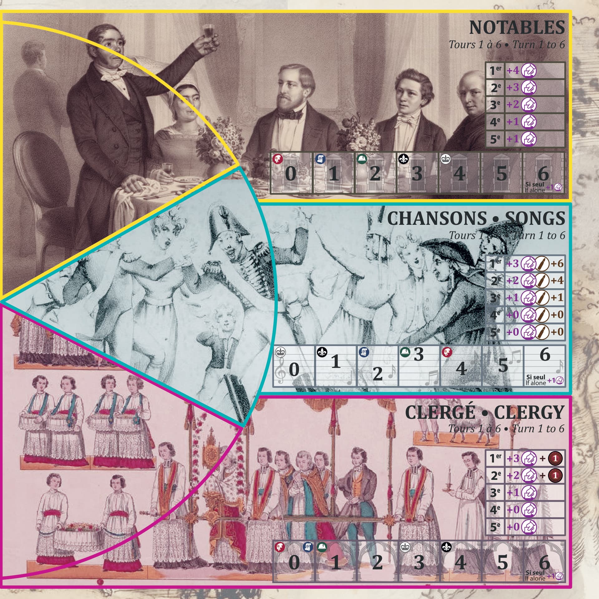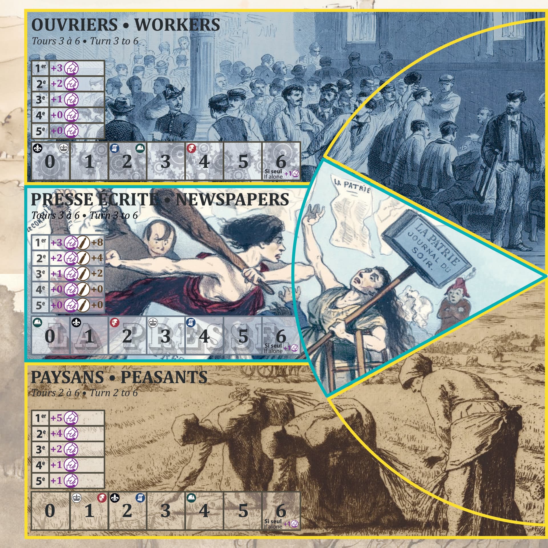 Une bonne nouvelle pour les joueurs qui possèdent la V1. L’éditeur est d’accord pour mettre en Print and play les 24 cartes événements et la fiche modifiée des Orléanistes.