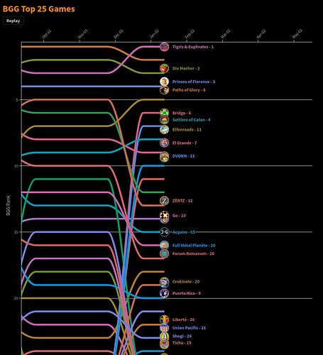 Je suis tombé (sans me faire mal, merci) sur cette animation de l’évolution du top BGG sur un quart de siècle (ouch, ça, ça fait mal) :