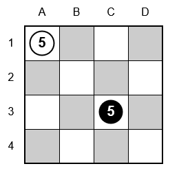 C’est aux blancs de jouer. le pion rond 5 est déplacé de A1 vers C2. Il peut prendre le pion noir en C3 et reste en B2.