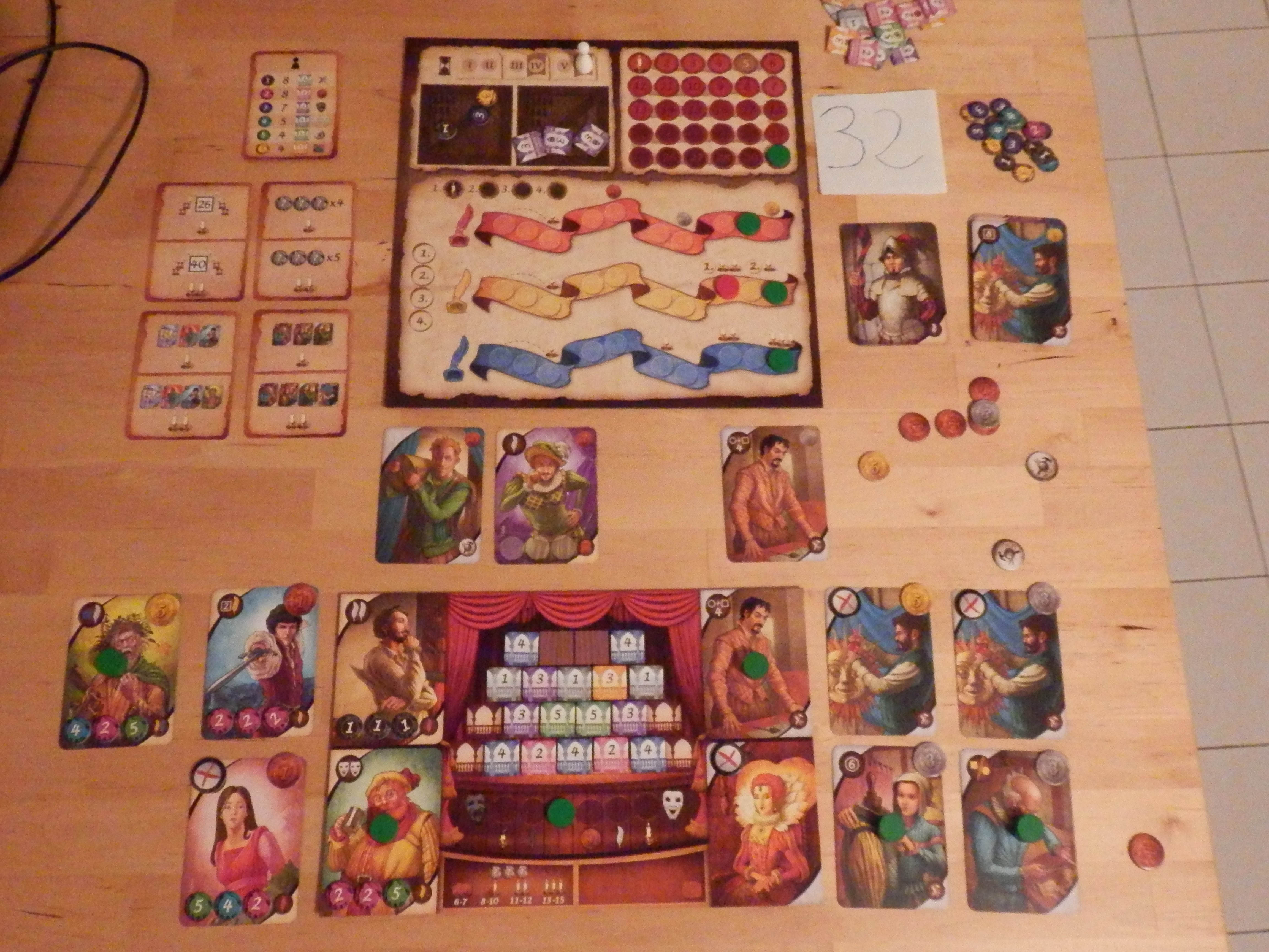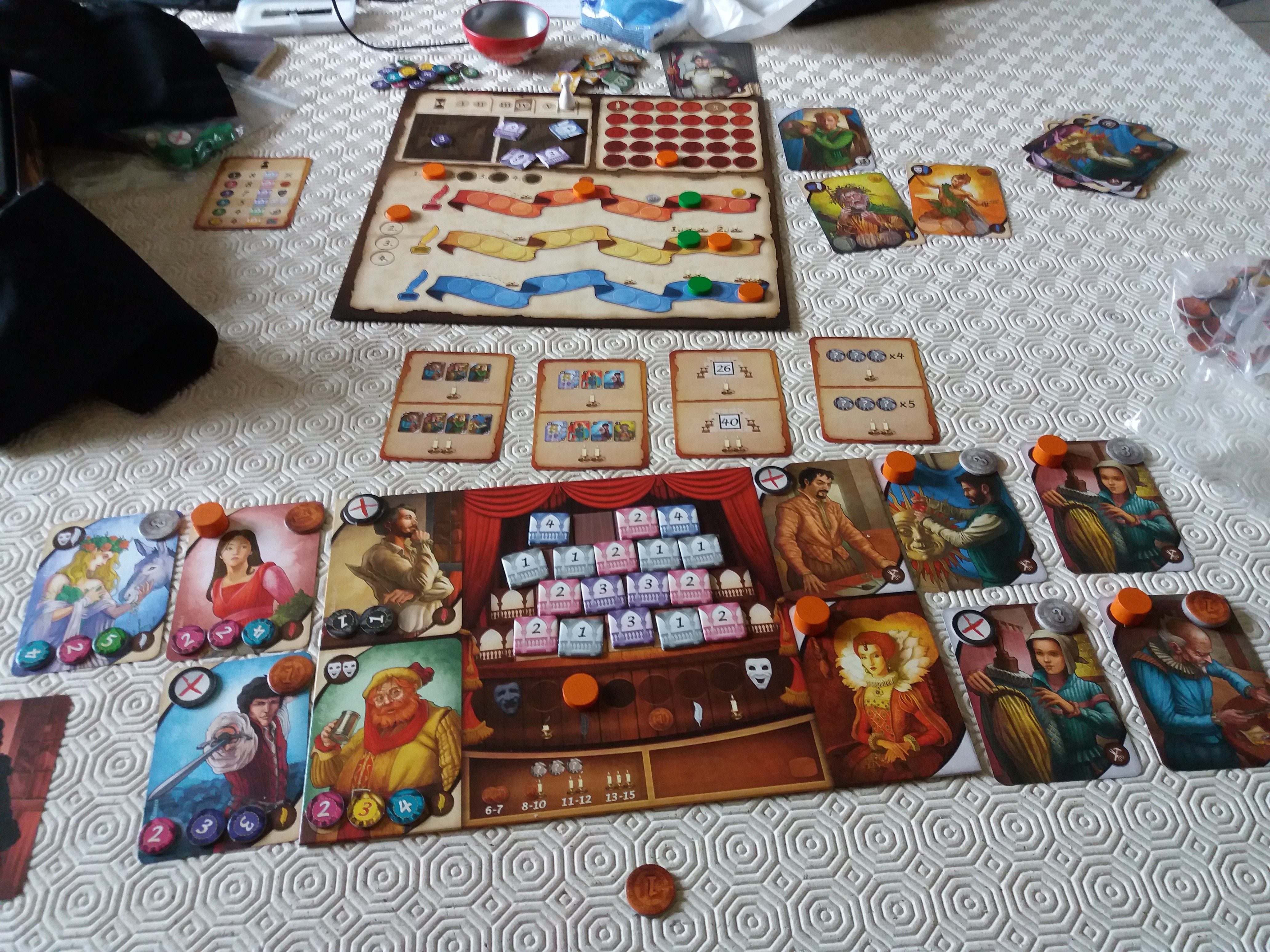 Je me suis vraiment beaucoup amusé sur cette partie. Le roi Lear a été pas mal déterminant, et j’ai eu de la chance sur le tirage des décors (pas de violet pendant les deux premières journées, le bleu réparti d’un jour sur l’autre). Comme Prunelles, j’ai tendance à recruter cher d’ordinaire, aussi ai-je été agréablement surpris de ne pas avoir de problème d’argent cette fois-ci. La combinaison Roméo et Juliette, en plus d’être thématique, se révèle diablement efficace pour costumer et construire le décor à pas cher !