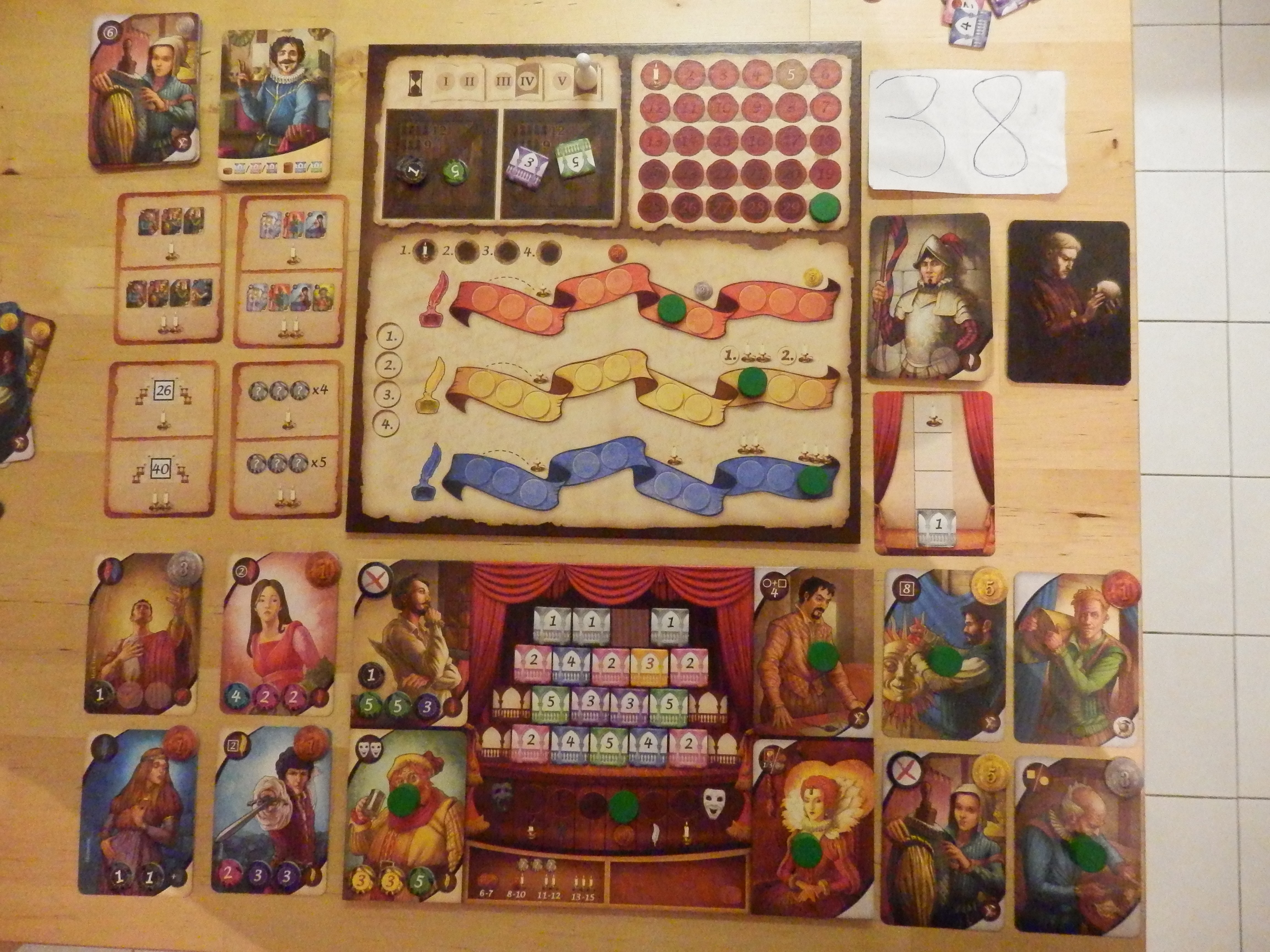 Les deux derniers tours sont moins glorieux. Je fais de très long calculs au début de l’acte 5 en anticipant les décors et costumes qui arriveront au dernier tour. Je programme tous mes coups sur deux tours en échafaudant plusieurs hypothèses sur le recrutement du dernier tour. Tout est réglé comme du papier à musique. Sauf qu’arrivé à l’acte 6 je me rend compte que j’avais tout planifié avec 6 actions !! Argh, ça a failli être le drame vu qu’il me manquait des sous. J’arrive à sauver les meubles en récupérant l’argent sur l’acte rouge et en costumant Iago à 8 mais mes répétitions en prennent un coup (et je perds deux points sur ce que j’avais prévu.)