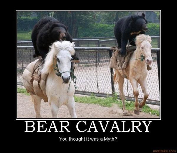 La Bear Cavalry est un meme récurent qu’on peut trouver sur les sites de demotivational et d’images à la con. Une des premières apparitions était une image d’un kosak sur un ours avec le sous-titre bien connu “where is your god now ?”