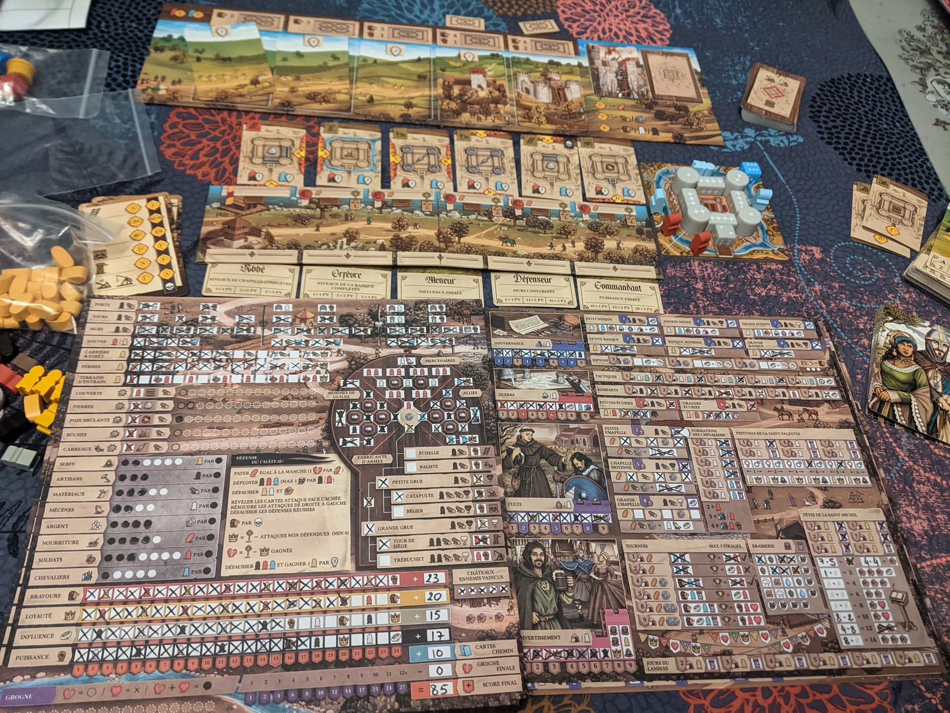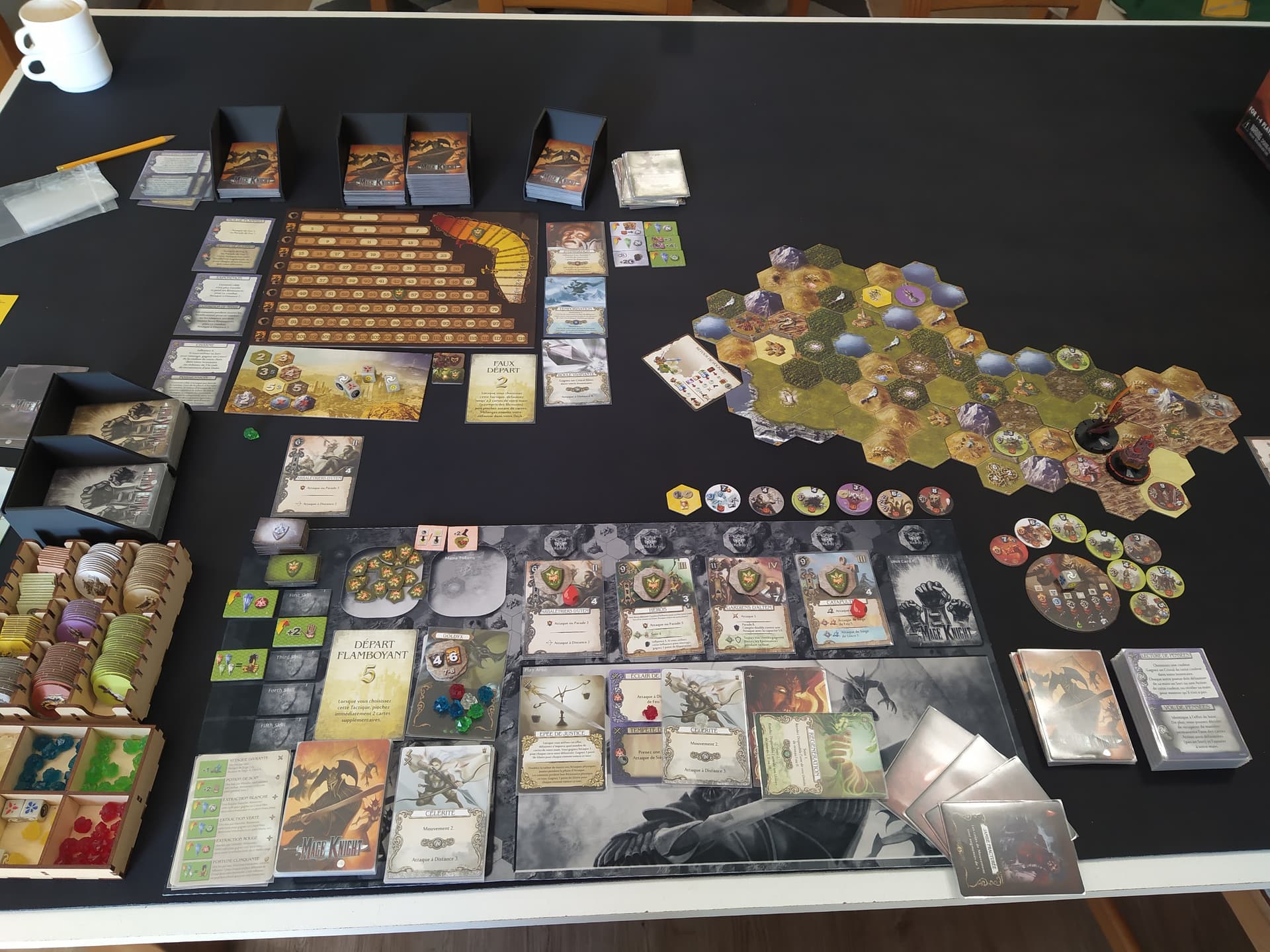 Le principal défaut du jeu est la place qu’il prend sur la table (90x120 cm), c’est beaucoup, je suis obligé de me lever attraper les cartes et atteindre l’autre bout du plateau ! Surtout que c’est qu’on a envie de laisser longtemps sur la table et faire plusieurs car l’installation est assez longue.