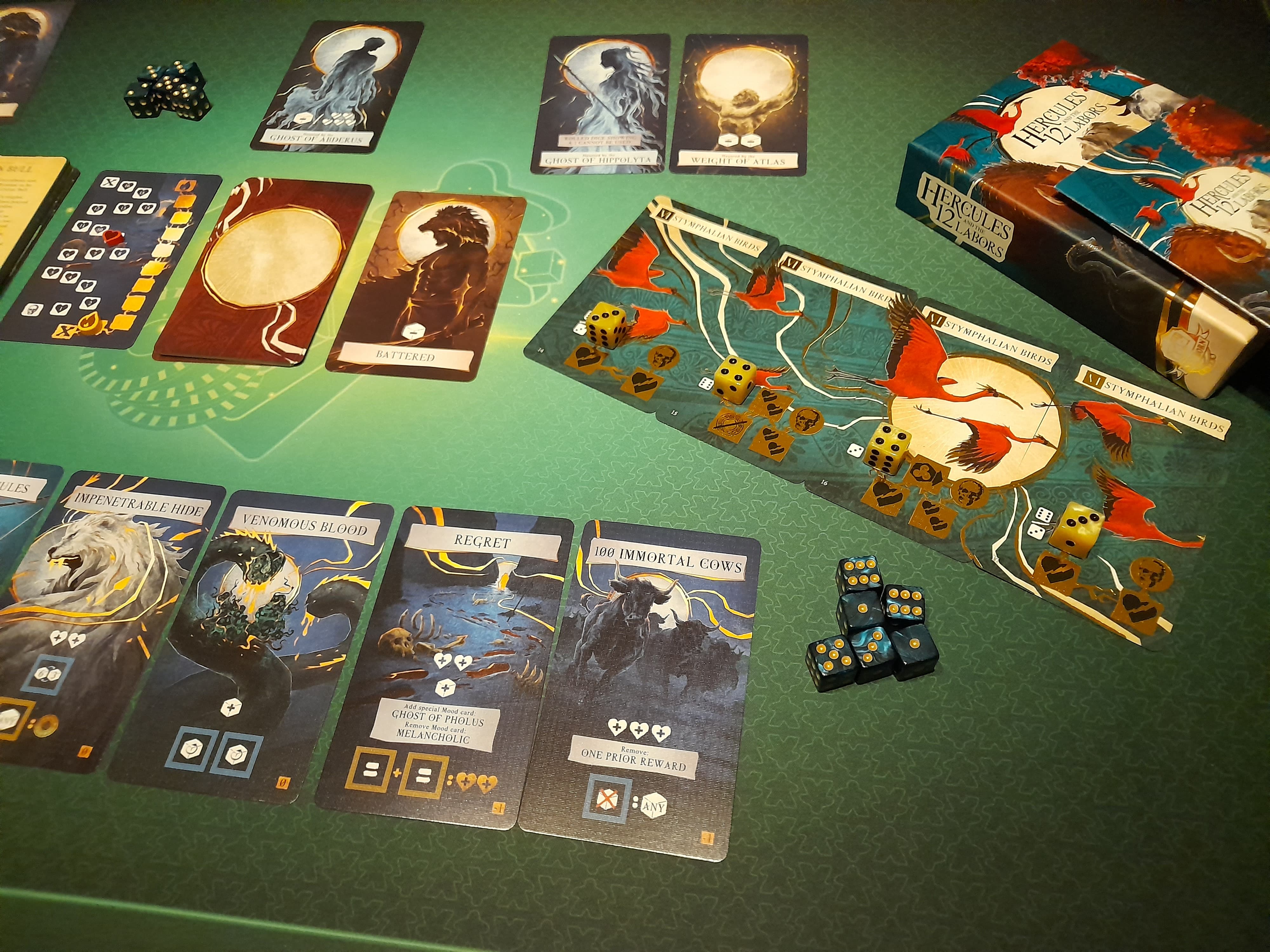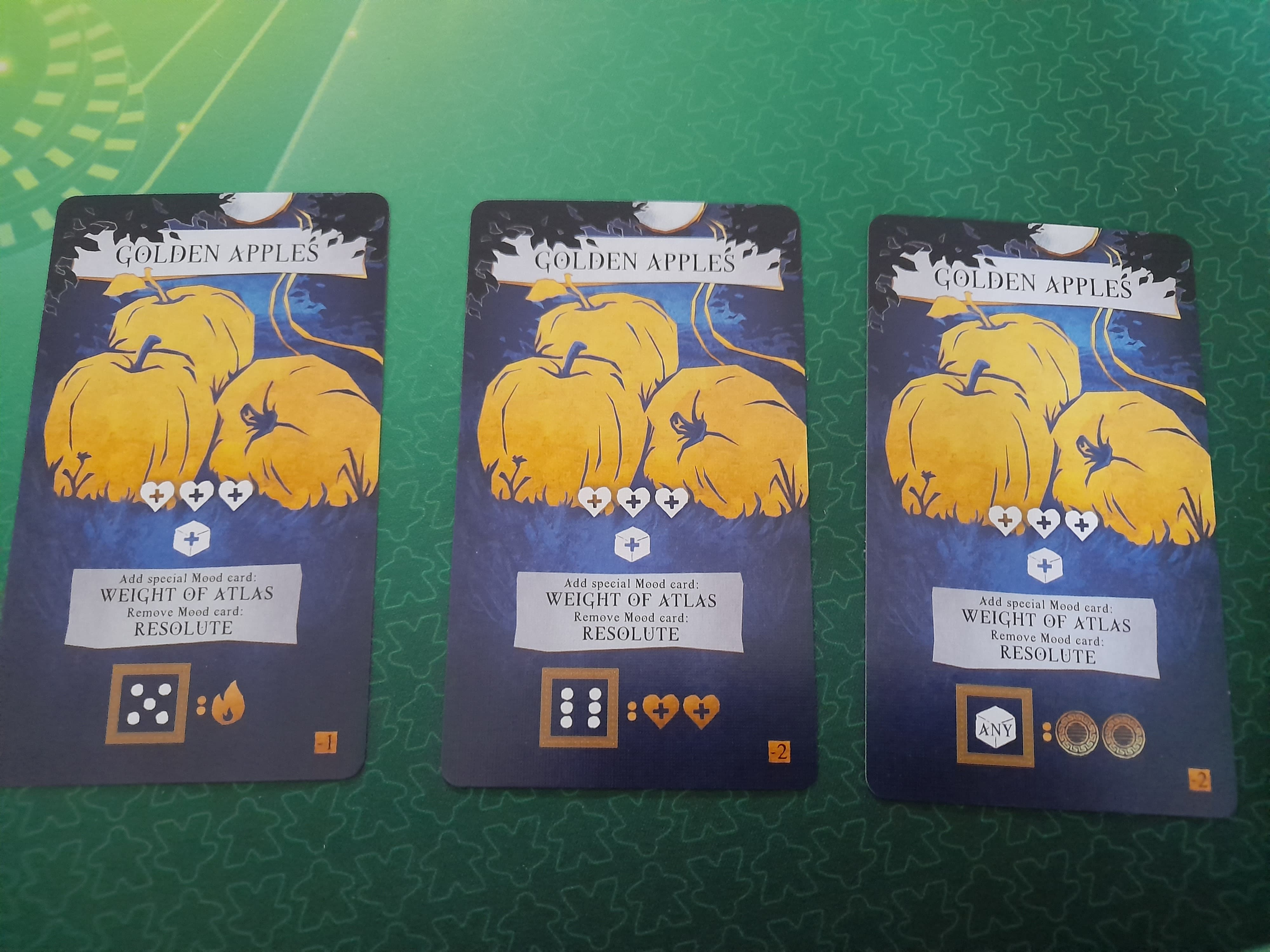 - Au début de chacun des 12 travaux tu tires une carte “humeur” qui donnera un avantage ou un handicap pour toute l’épreuve (1 carte sur 9 possibles, 4 cartes viendront remplacer les cartes de base au fil des épreuves)