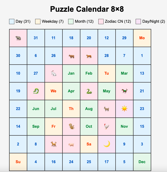 Là ce serait le même principe, on ujtilise les 12 pentaminos, le set classique donc, y’a toujours 4 trous dans la grille : jour de la semaine + jour + mois + au choix jour/nuit ou zodiac chinois ; et y’a au moins une solution pour chaque puzzle valide. La plupart du temps y’en a même des centaines mais bon courage pour en trouver ne serait-ce qu’une sans tricher ![]()