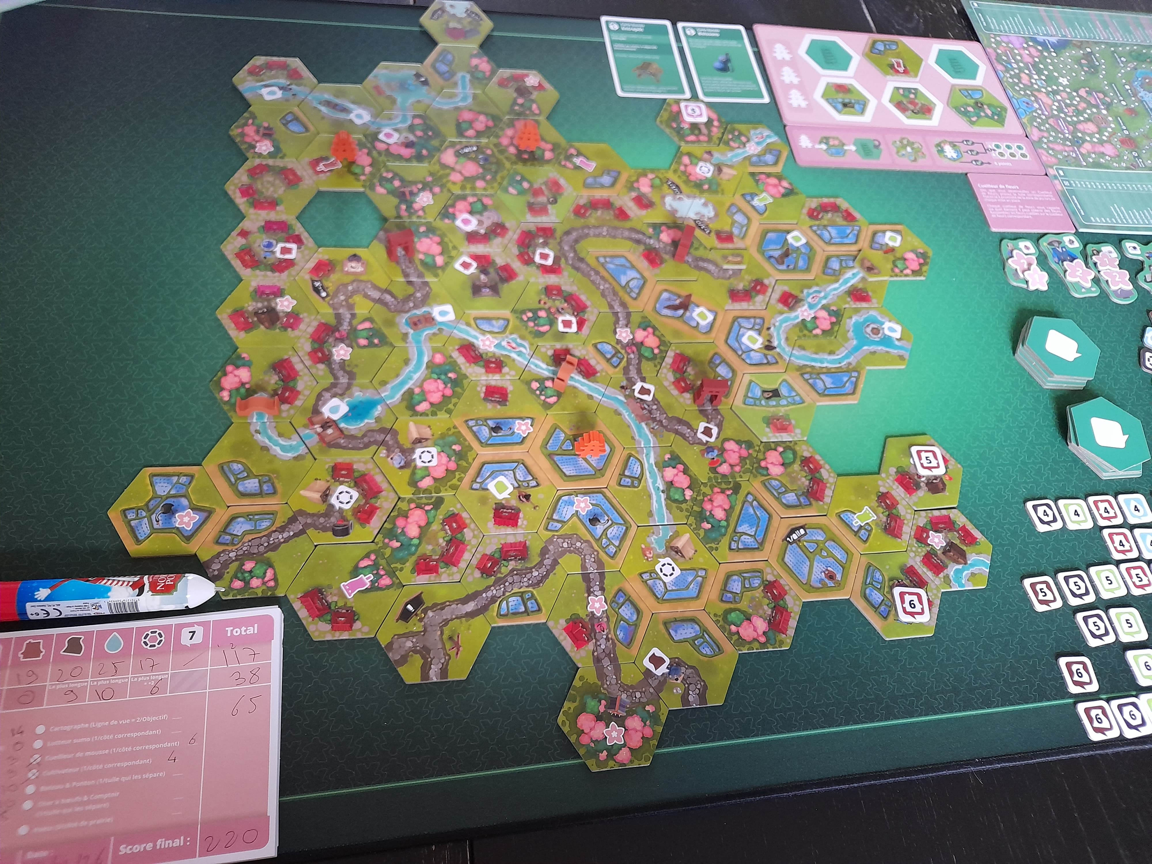 Le scénario est réussi avec quelques variantes par rapport à mes réflexes : je ne monte pas la génération de bouffe au max (besoin des jaunes ailleurs dont les douves + montée pour générer un soldat rouge par tour), mes murs sont moins hauts que d’habitude et je joue la défense pas mal avec les pions noirs.
