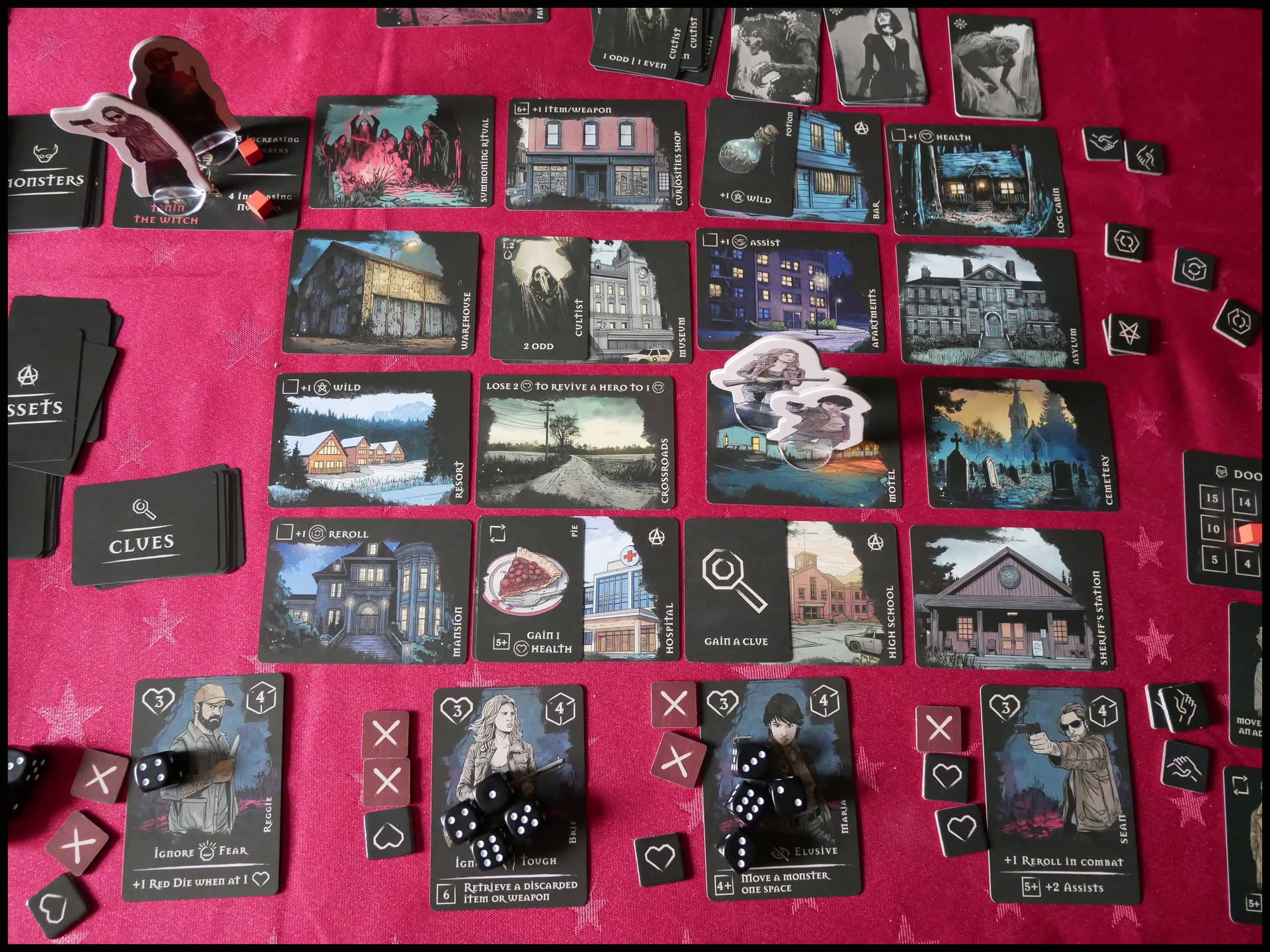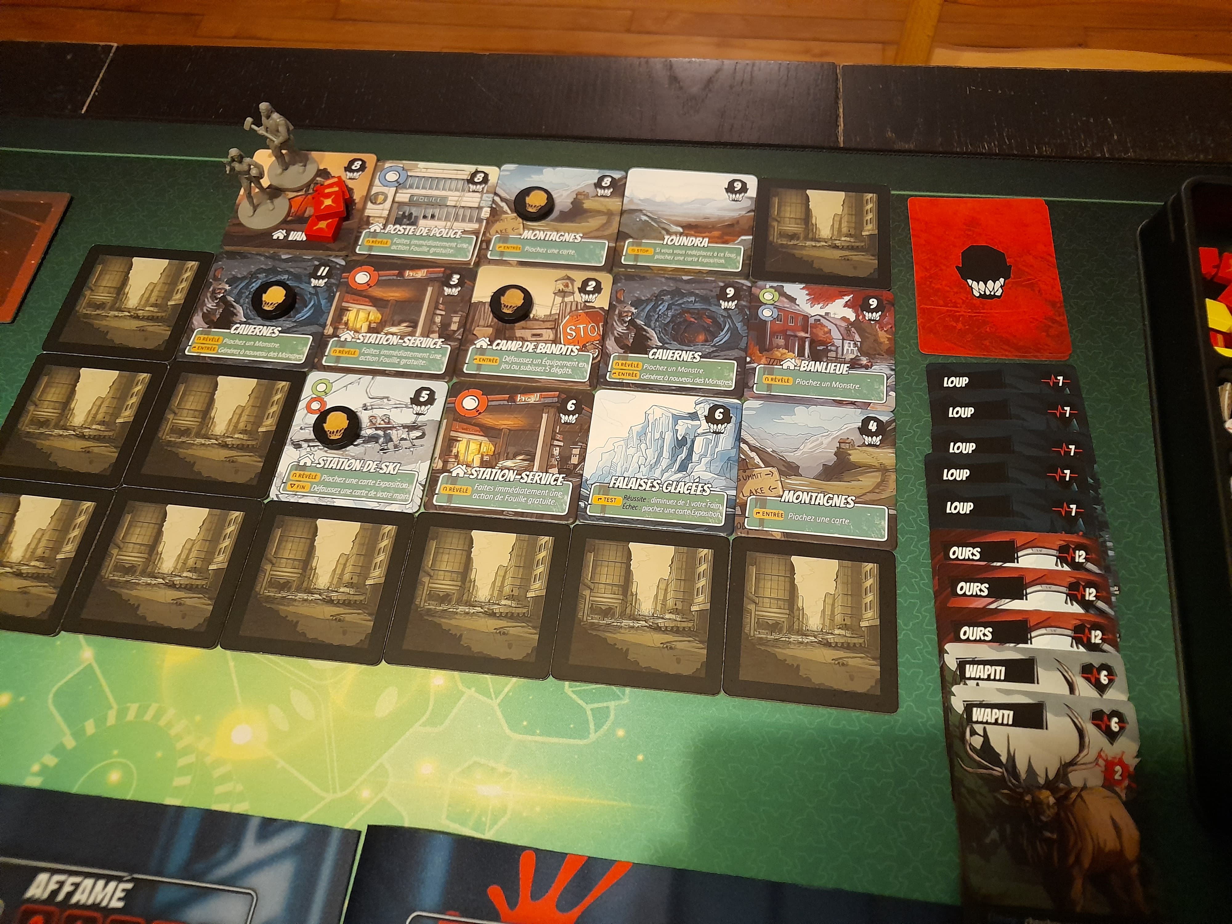 La partie commence mal dès la mise en place : tempête de neige sur la station, les déplacements à l’extérieur sont faits au hasard. Bon, déjà la stratégie de sauver des victimes pour avoir des bonus, on oublie. Mais ça fait surtout deux tests sanguins difficilement accessibles, car 2 zones à fouiller accessibles en passant par l’extérieur. Pour l’adversité, je vais être servi !