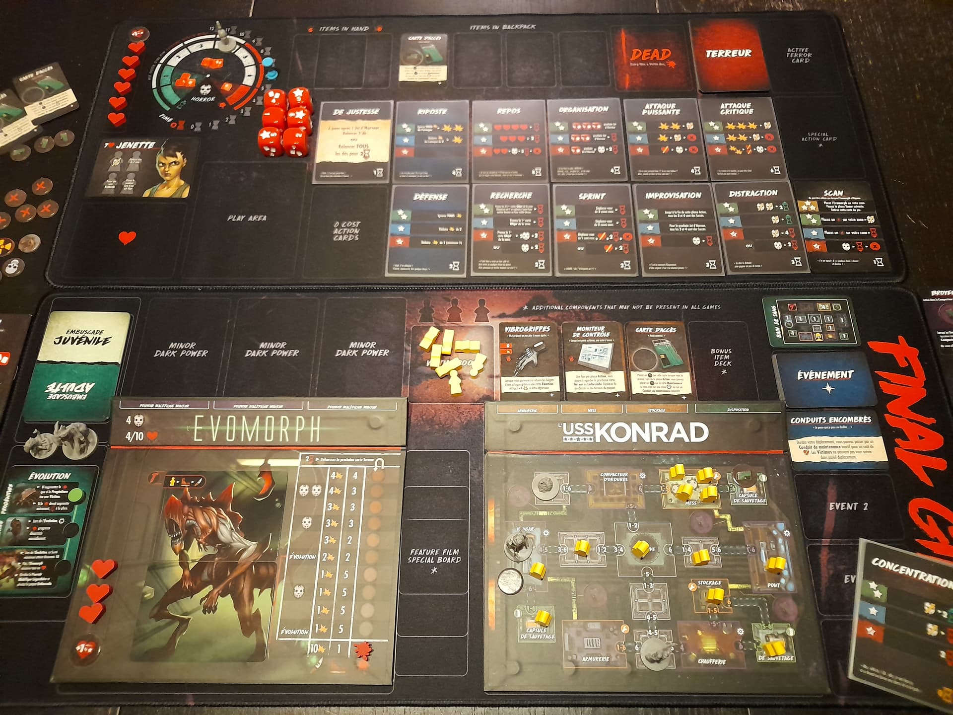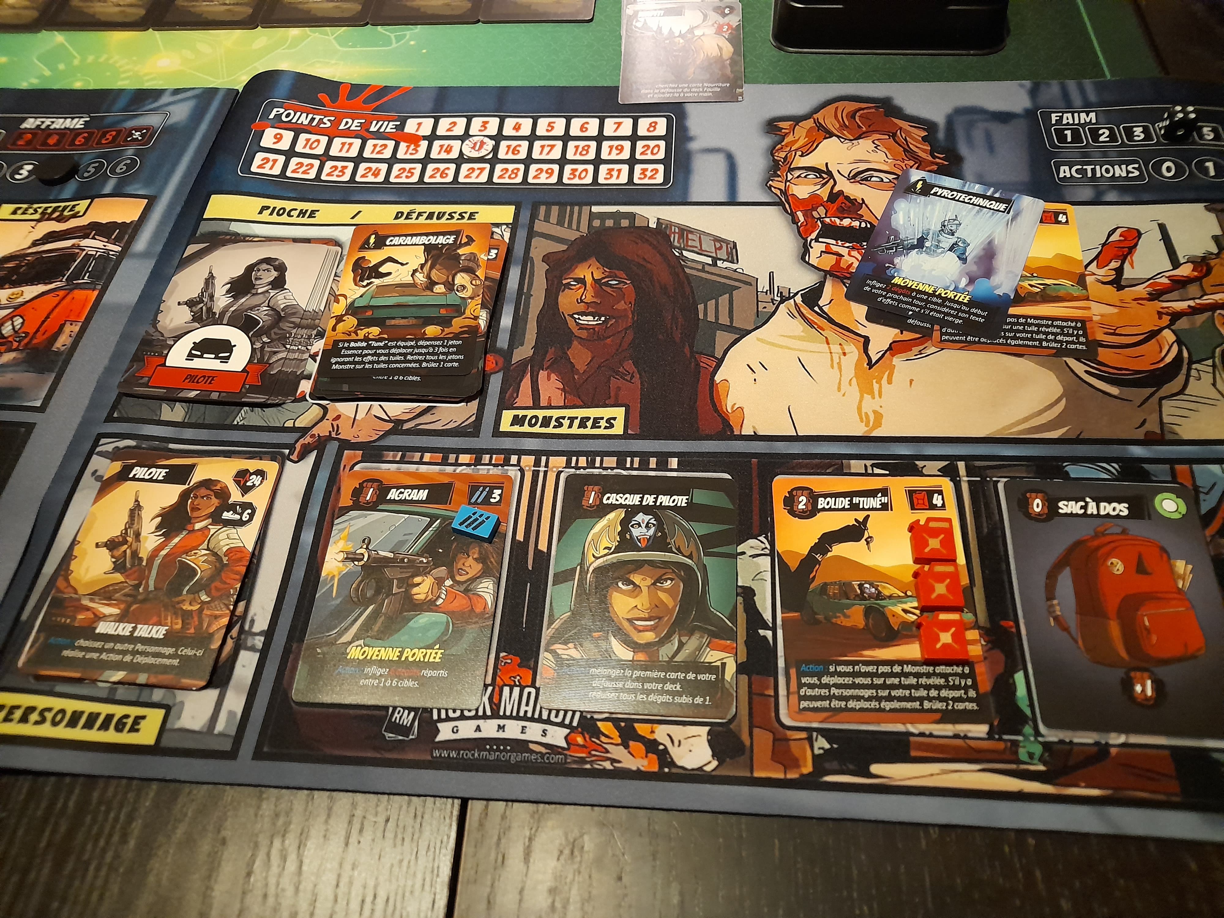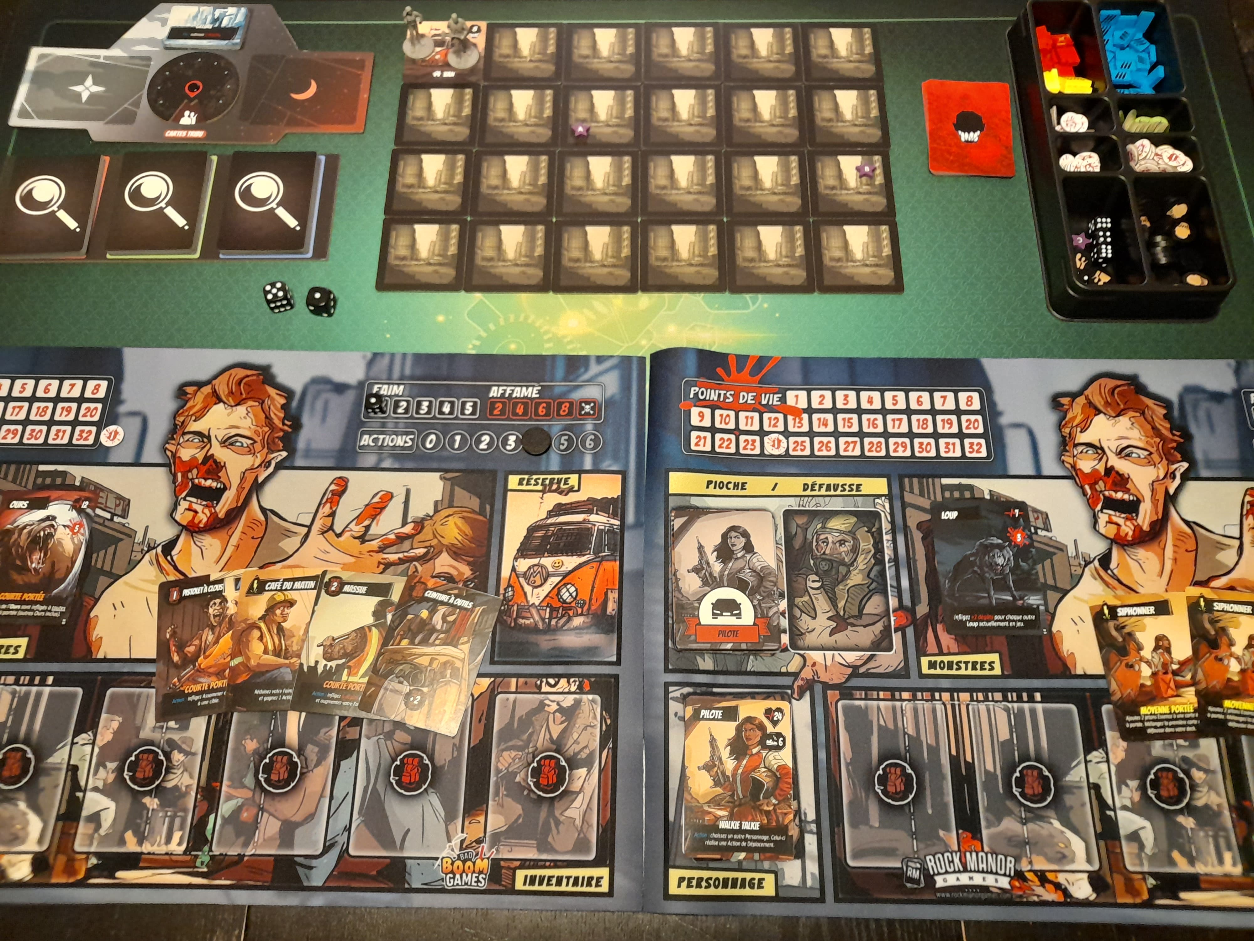 Le final a été épique : les seules victimes rescapées sont celles qui étaient dans les bâtiments à l’extérieur du bâtiment principal, toutes les autres sont mortes et je me suis retrouvé coincée au labo avec 2 organismes contaminés qui s’acharnaient sur moi. Après en avoir achevée une, la deuxième m’attaque. Je “riposte”, et nous perdons tous les deux notre dernier point de vie. Je retourne les pions : +1 pt de vie pour lui, +2 pour moi. Encore un tour, et j’ai “Attaque puissante” dans la main, plus d’autres cartes en cas de 3 ou 4. un 6, il perd son dernier point de vie.