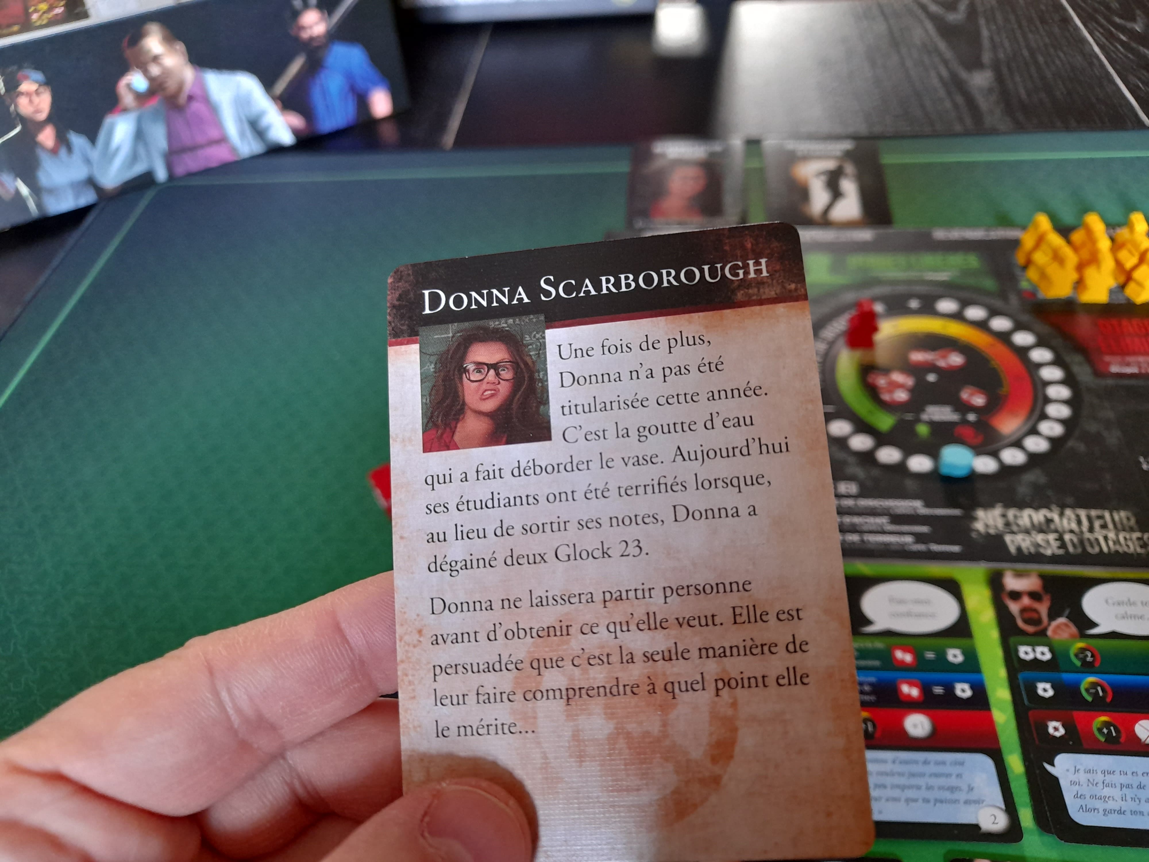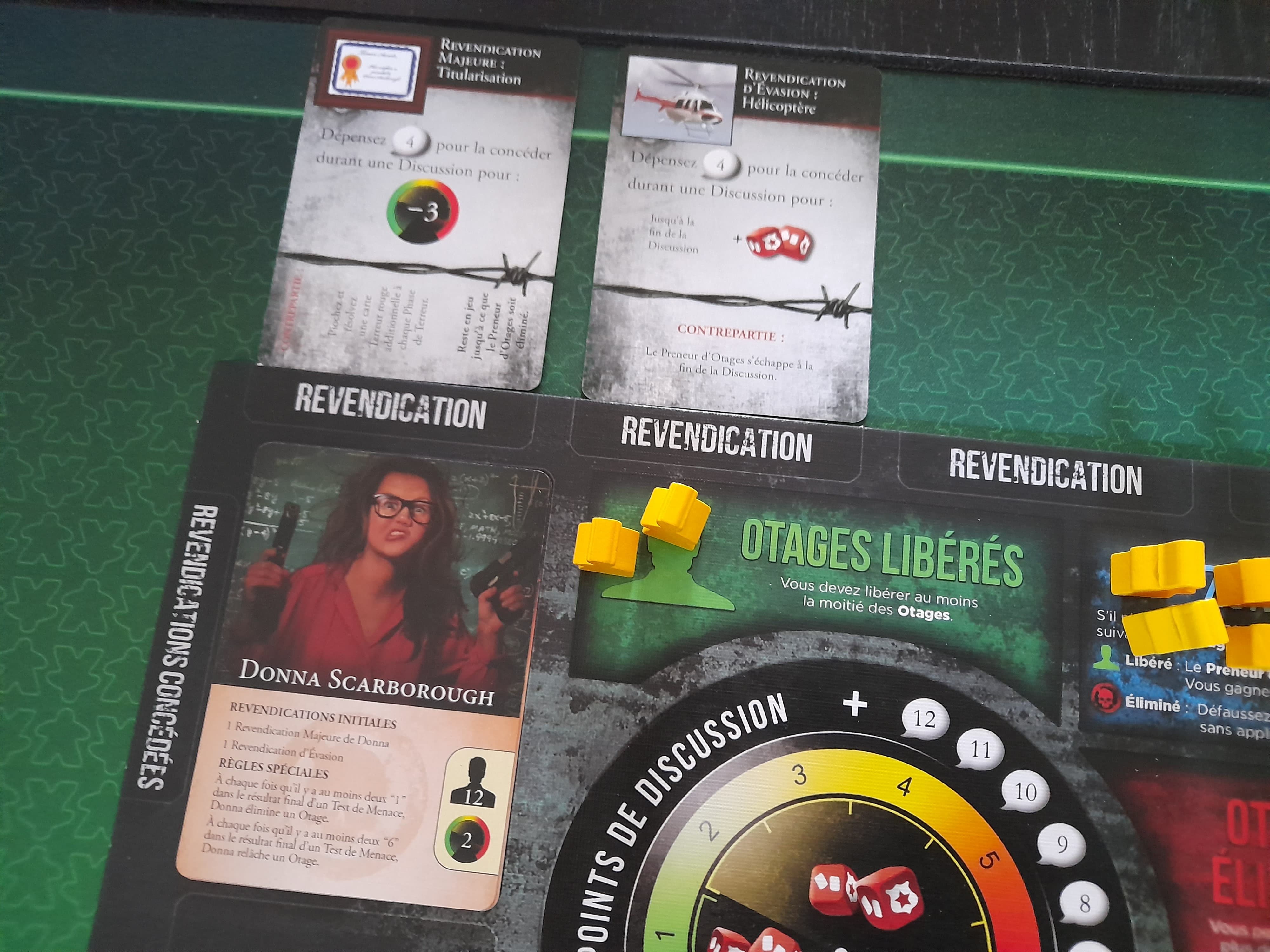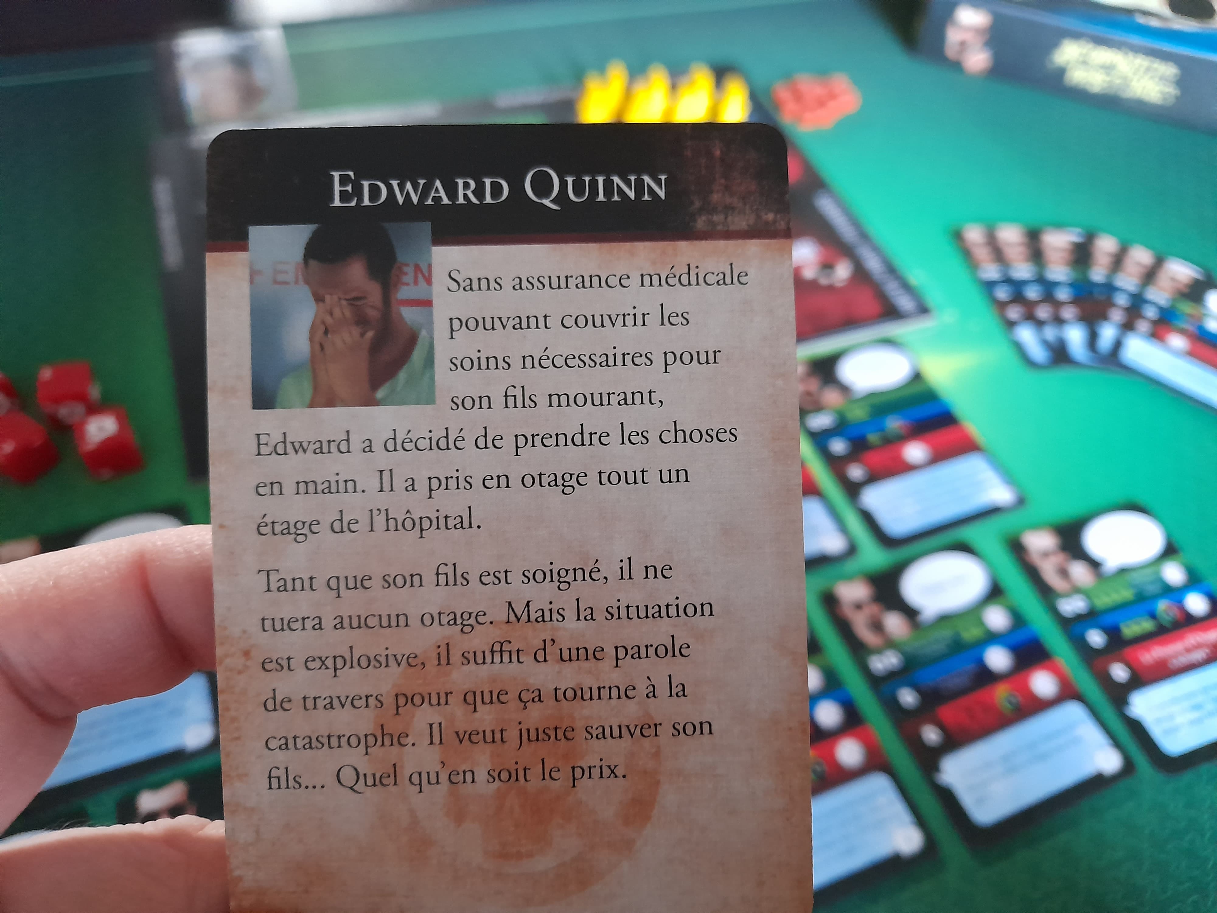 Le final a été épique : les seules victimes rescapées sont celles qui étaient dans les bâtiments à l’extérieur du bâtiment principal, toutes les autres sont mortes et je me suis retrouvé coincée au labo avec 2 organismes contaminés qui s’acharnaient sur moi. Après en avoir achevée une, la deuxième m’attaque. Je “riposte”, et nous perdons tous les deux notre dernier point de vie. Je retourne les pions : +1 pt de vie pour lui, +2 pour moi. Encore un tour, et j’ai “Attaque puissante” dans la main, plus d’autres cartes en cas de 3 ou 4. un 6, il perd son dernier point de vie.