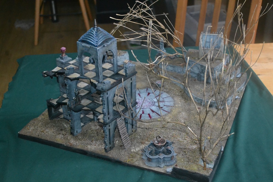 La partie s’est jouée sur le premier scénario “La Plaine Dévastée”, avec une disposition de décors simple et basique. On peut voir au déploiement les 5 objectifs du scénario, le calice au centre qui est l’objectif principal et les 4 objectifs annexes autour (les 2 colonnes, la statue et le coffre).